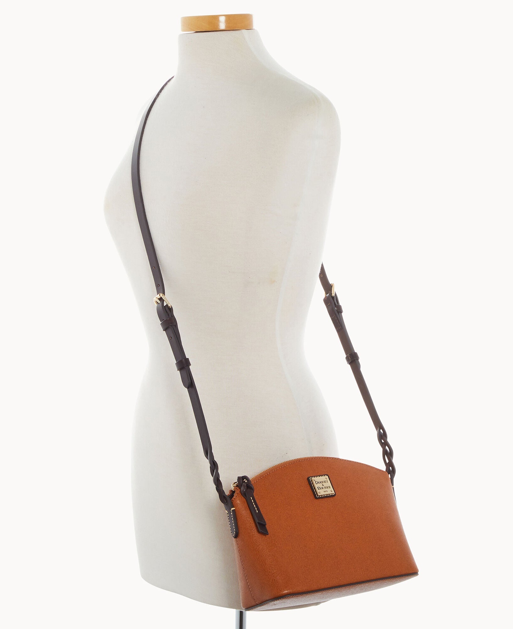 One outside pocket. One inside zip pocket. Two inside pockets. Cell phone pocket. Adjustable shoulder strap. Strap drop length 24.5". Lined. Zipper closure.