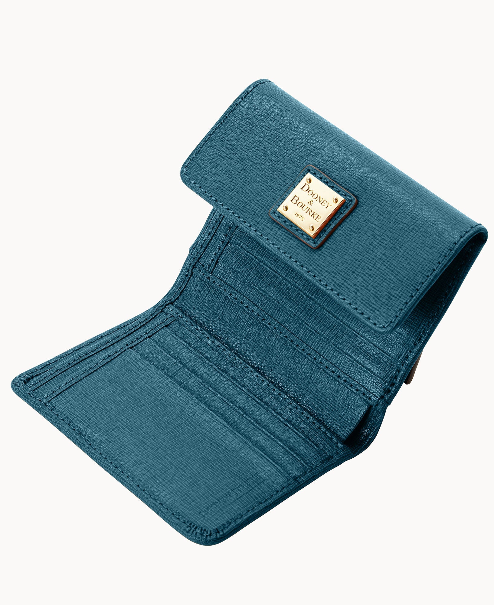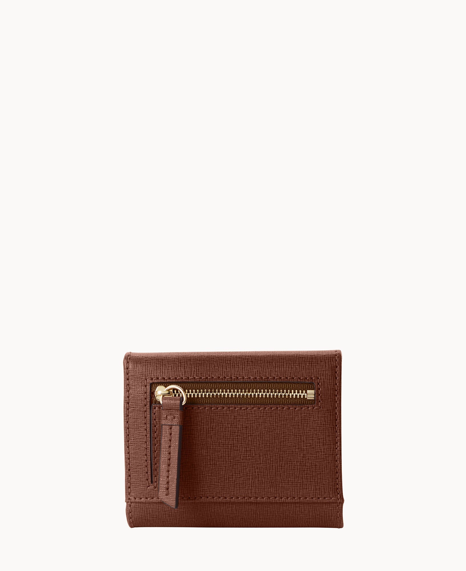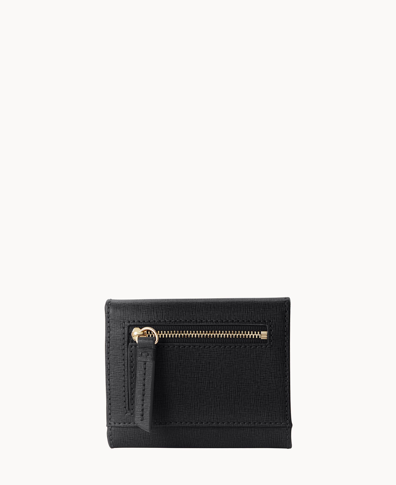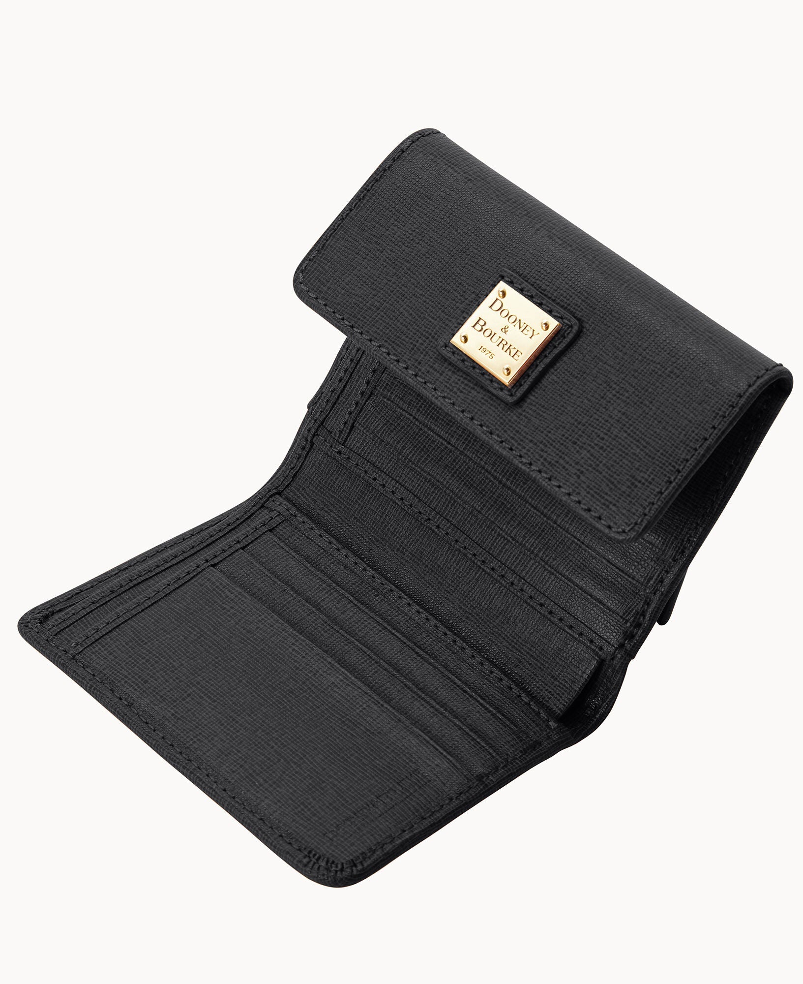One outside zip pocket. One bill compartment. Four inside pockets. Six credit card slots. Snap closure.