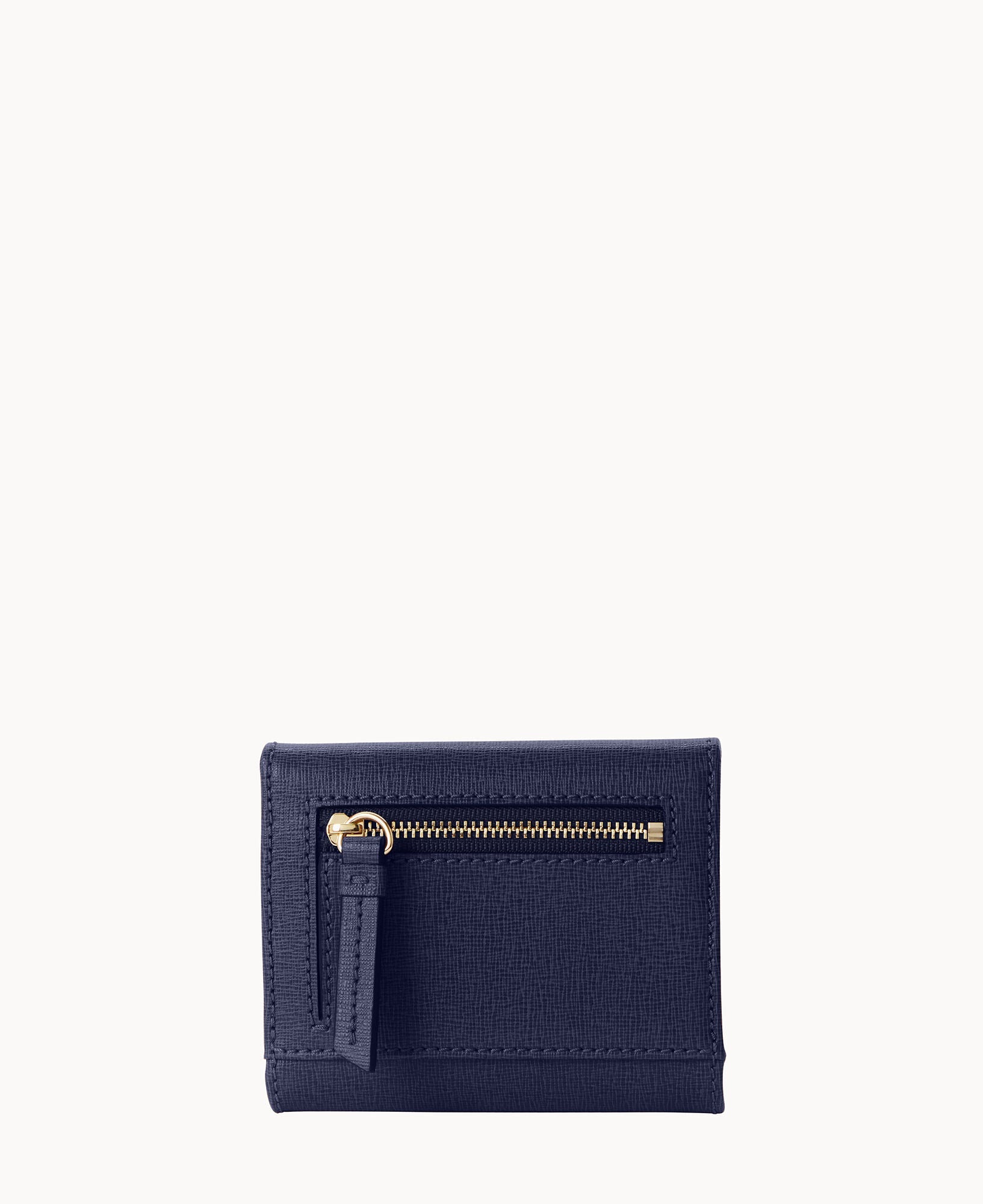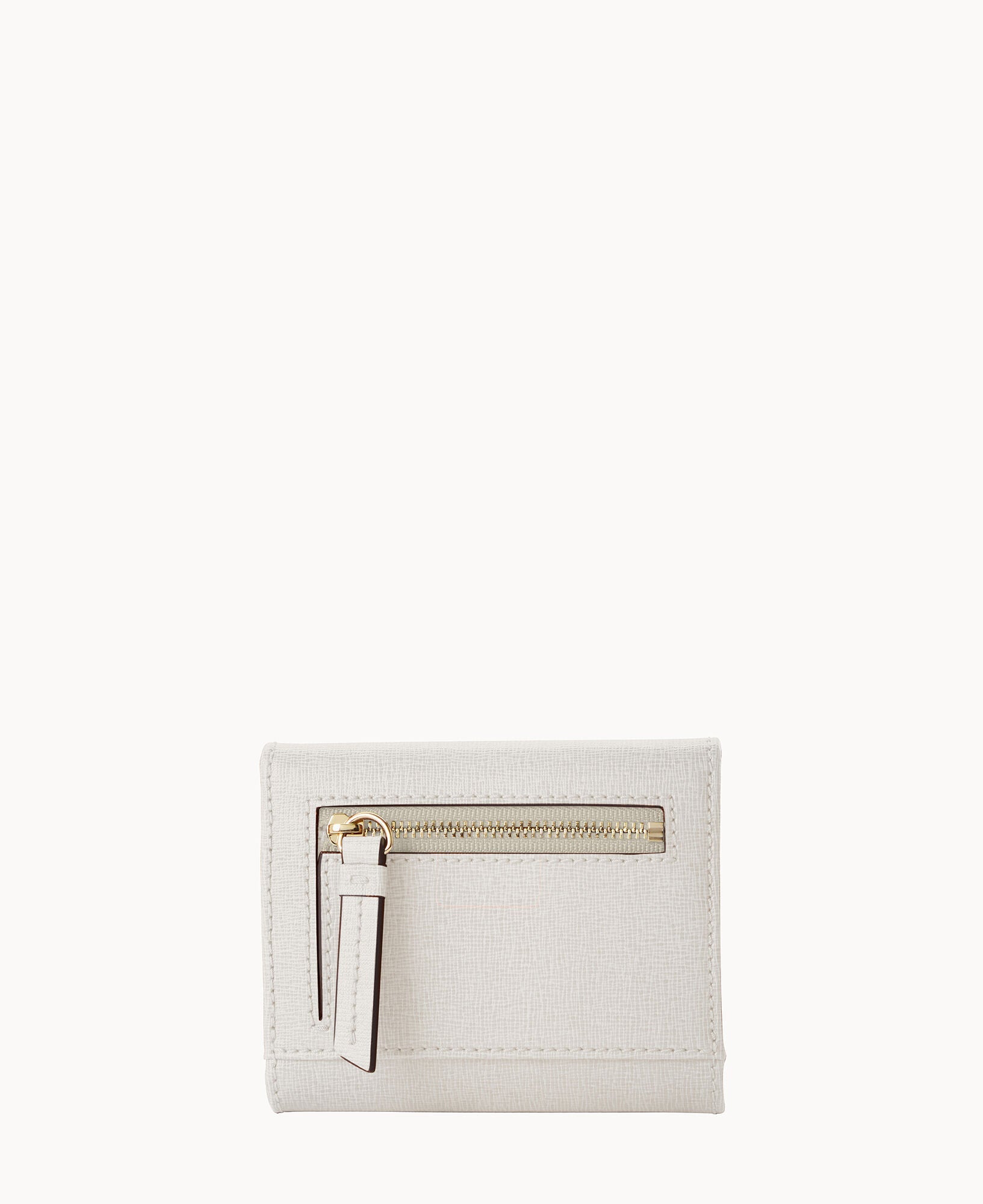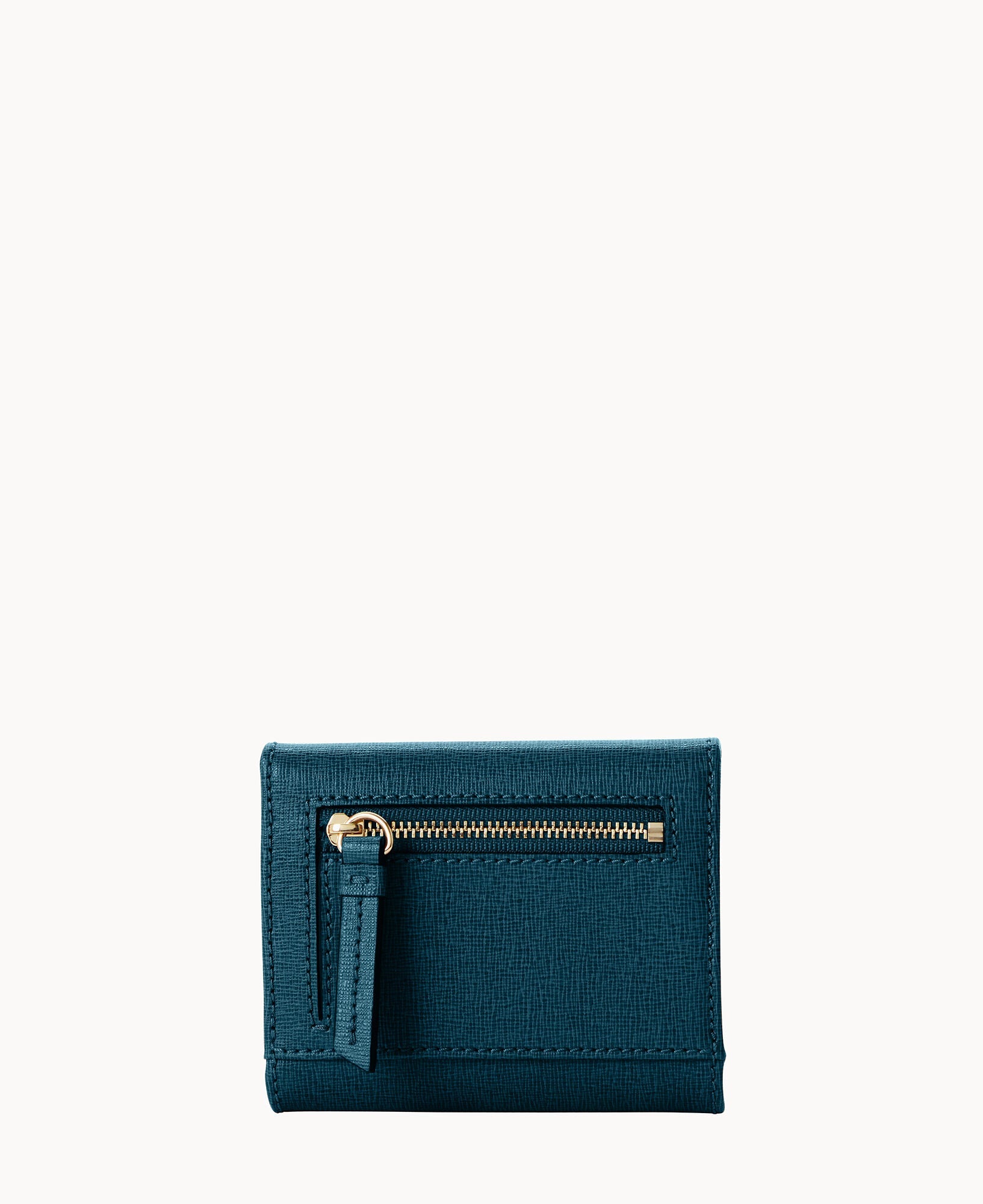 One outside zip pocket. One bill compartment. Four inside pockets. Six credit card slots. Snap closure.