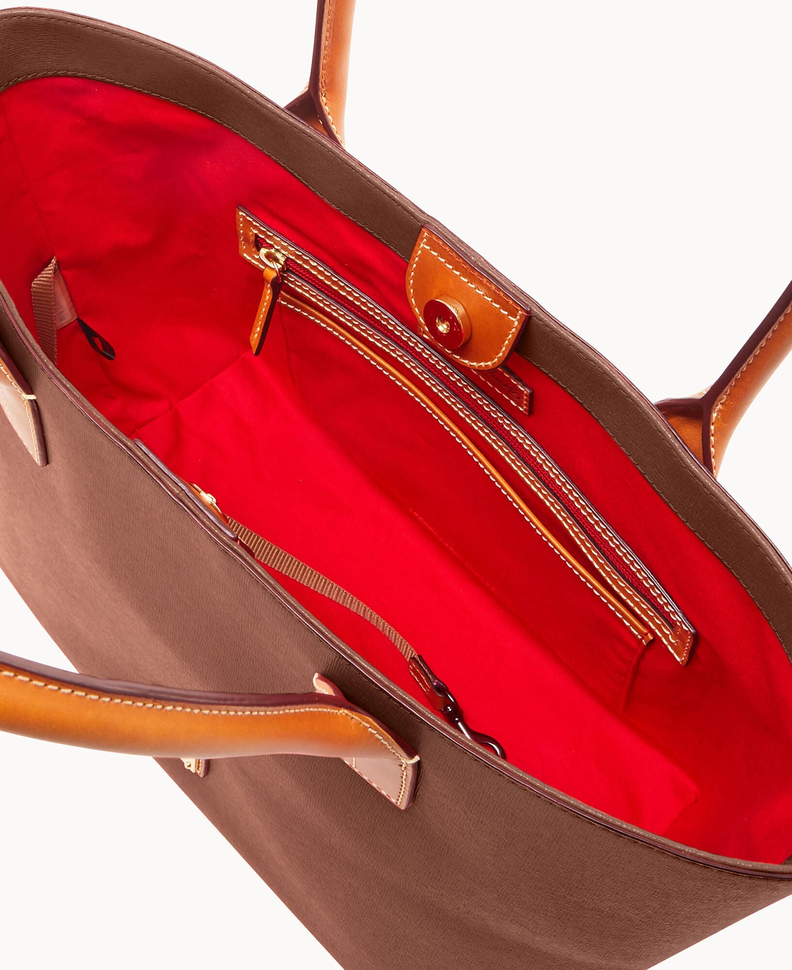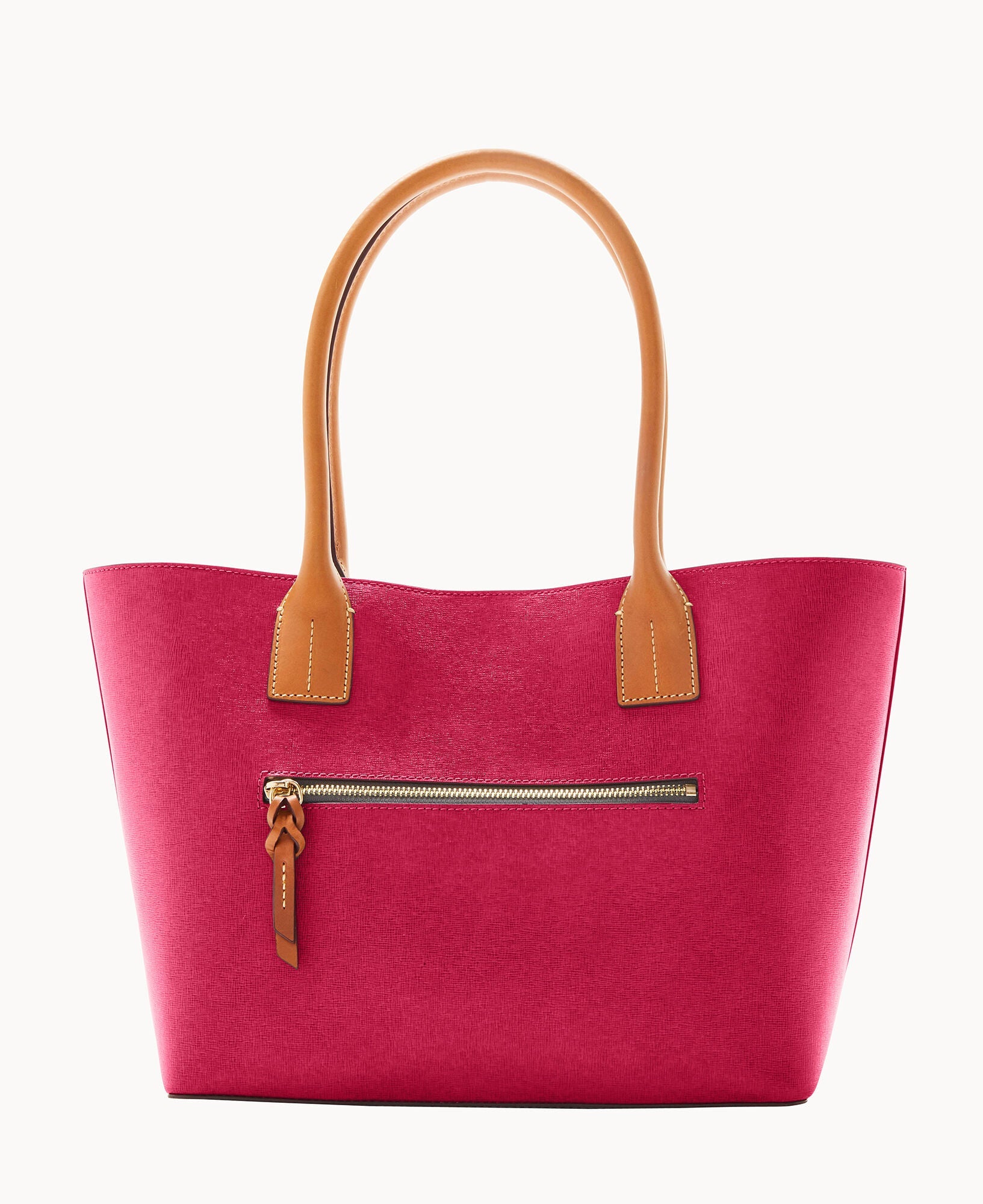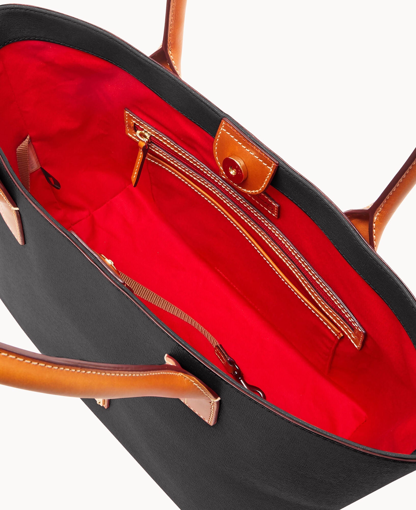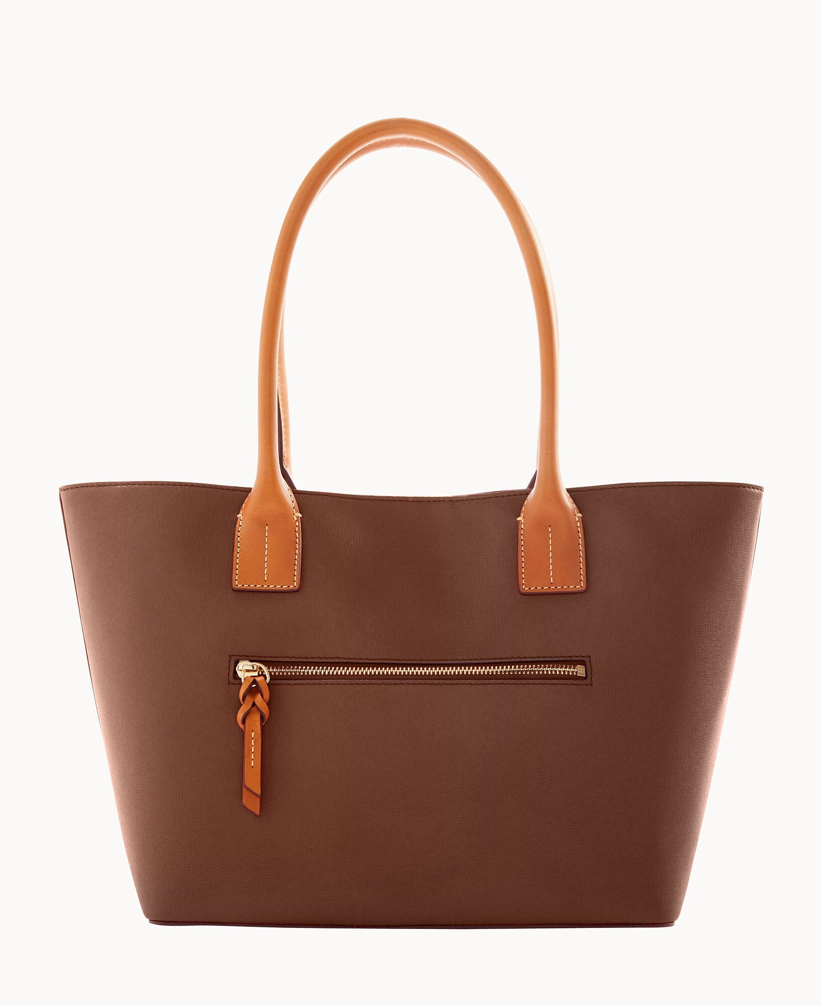 Outside zip pocket. One inside zip pocket. Two inside pockets. Cell phone pocket. Inside key hook. Handle drop length 8.5". Lined. Magnetic snap closure. Feet.