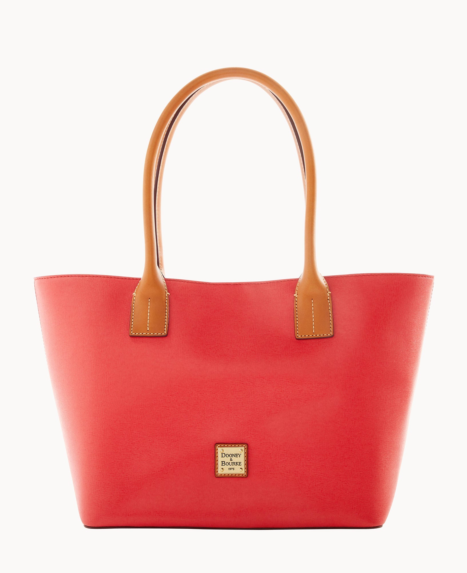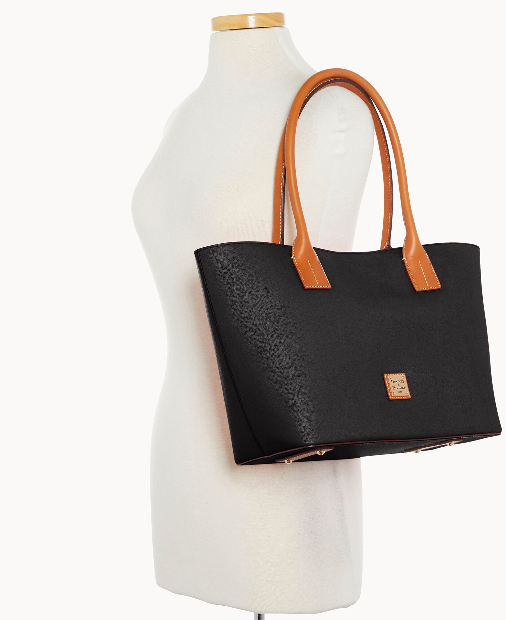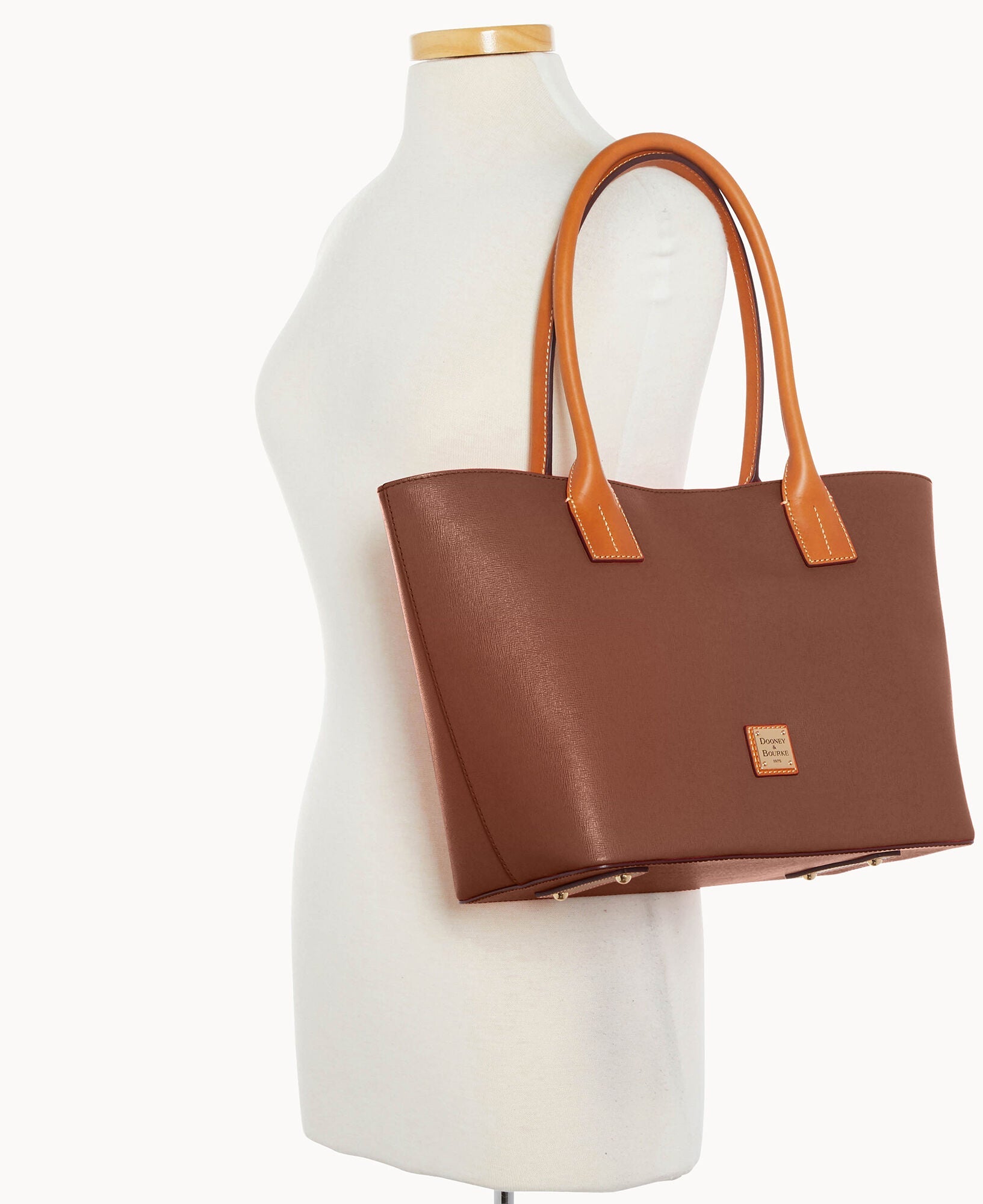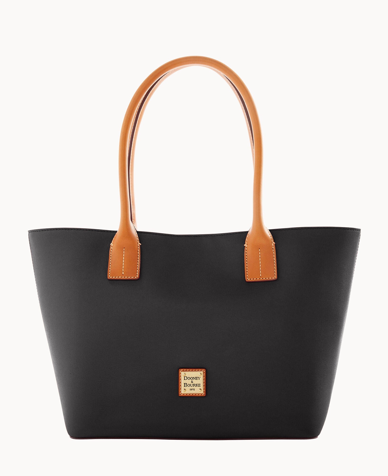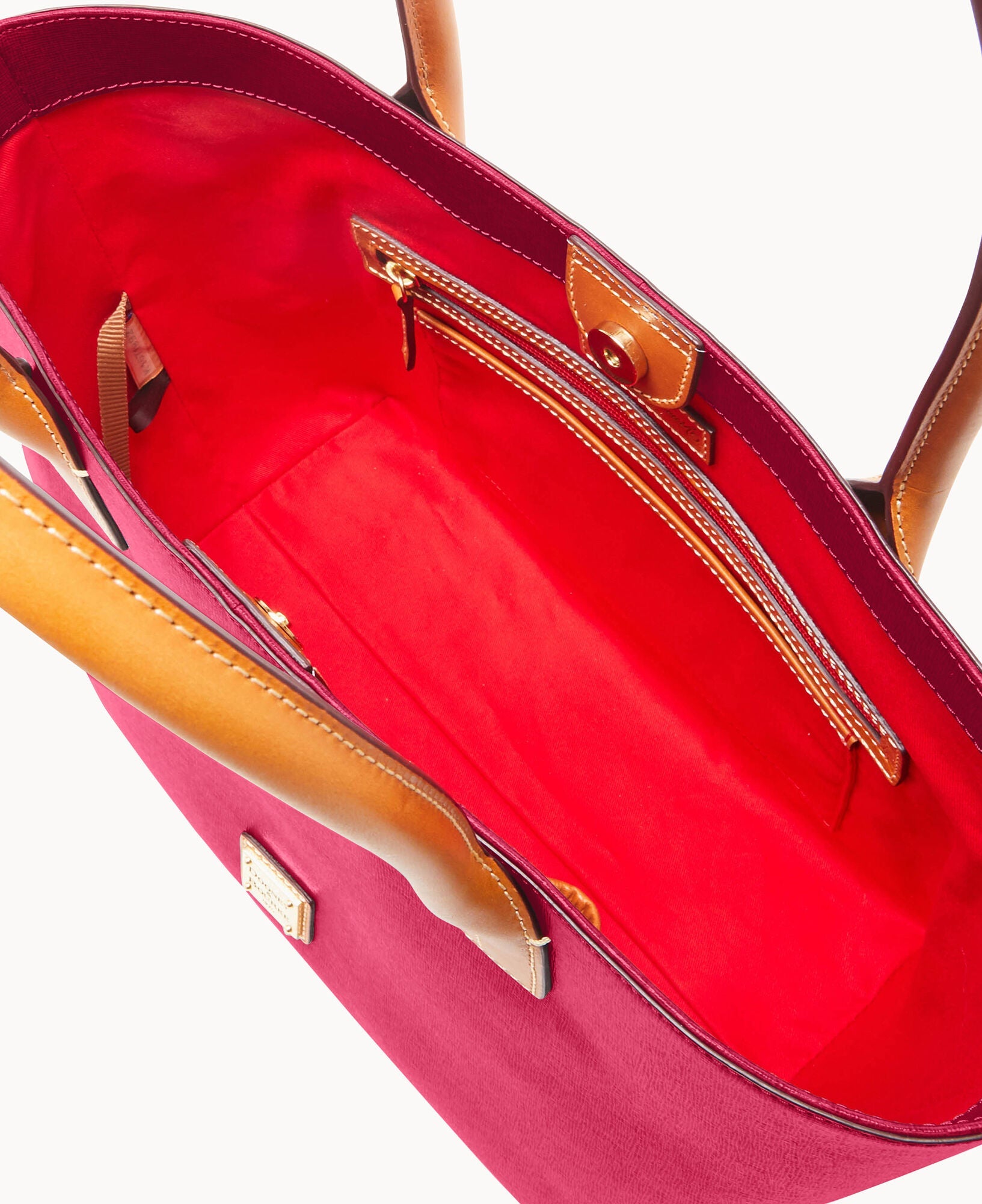 Outside zip pocket. One inside zip pocket. Two inside pockets. Cell phone pocket. Inside key hook. Handle drop length 8.5". Lined. Magnetic snap closure. Feet.