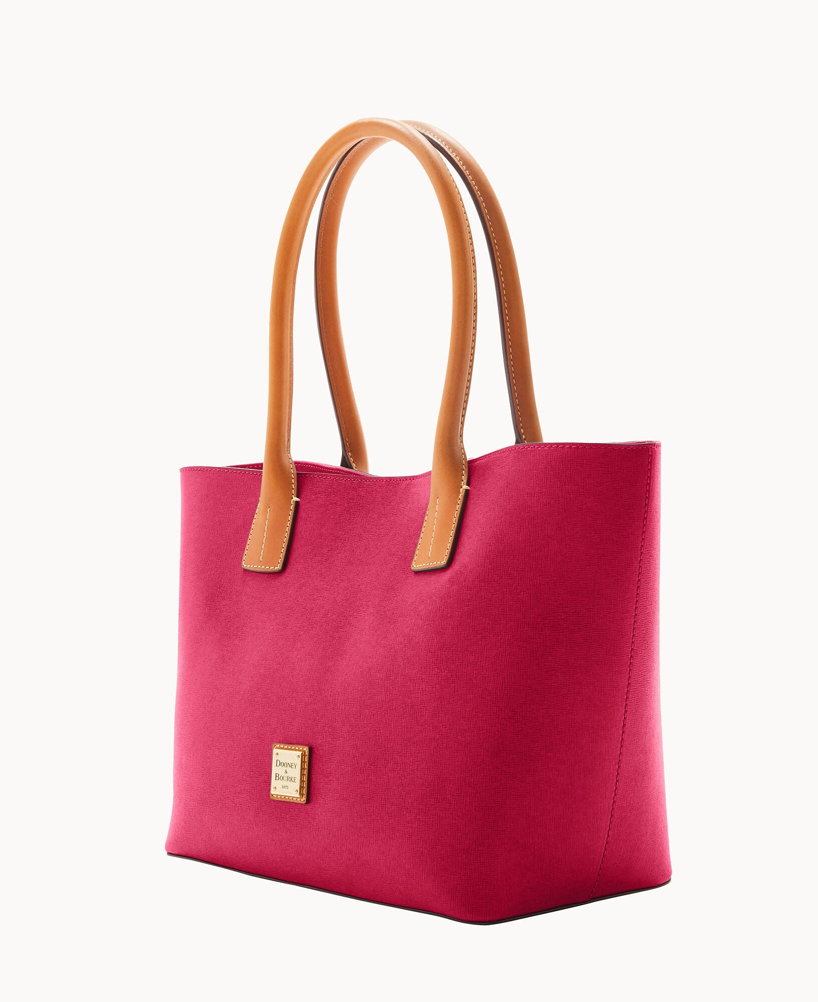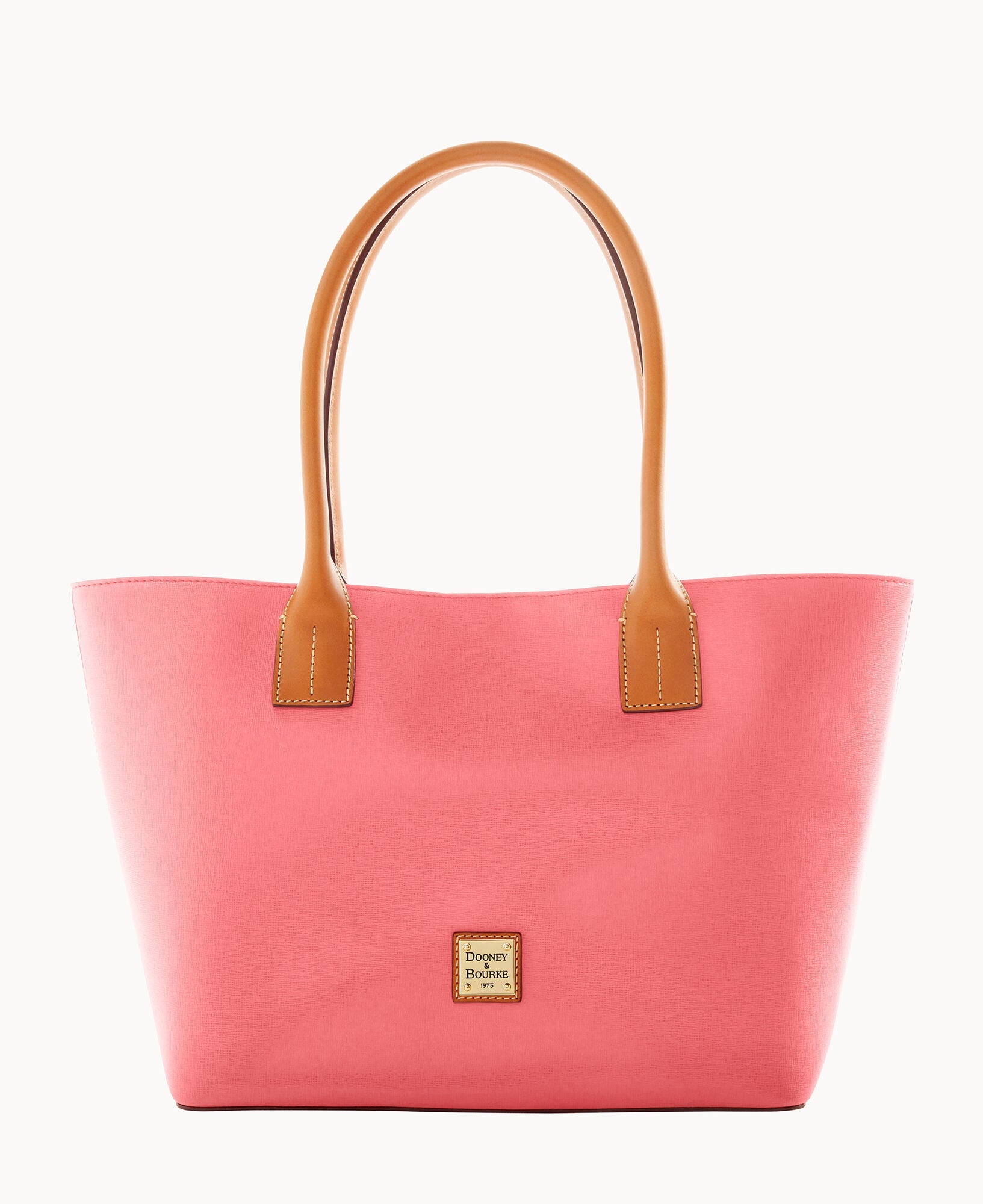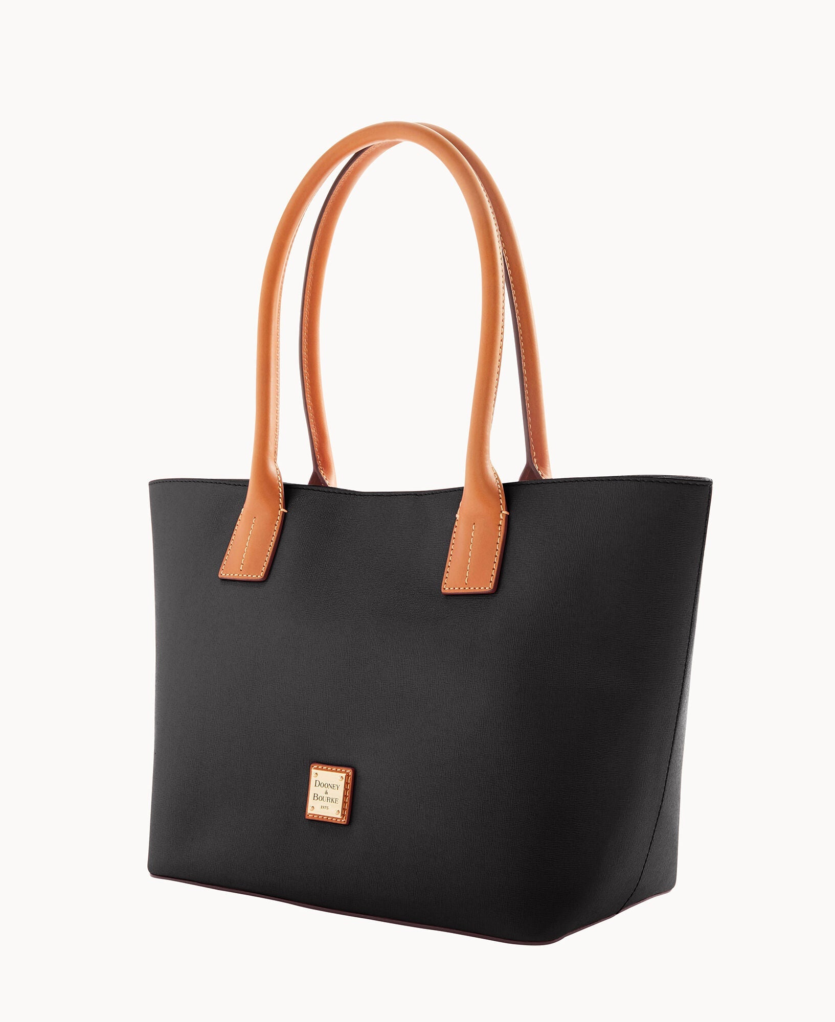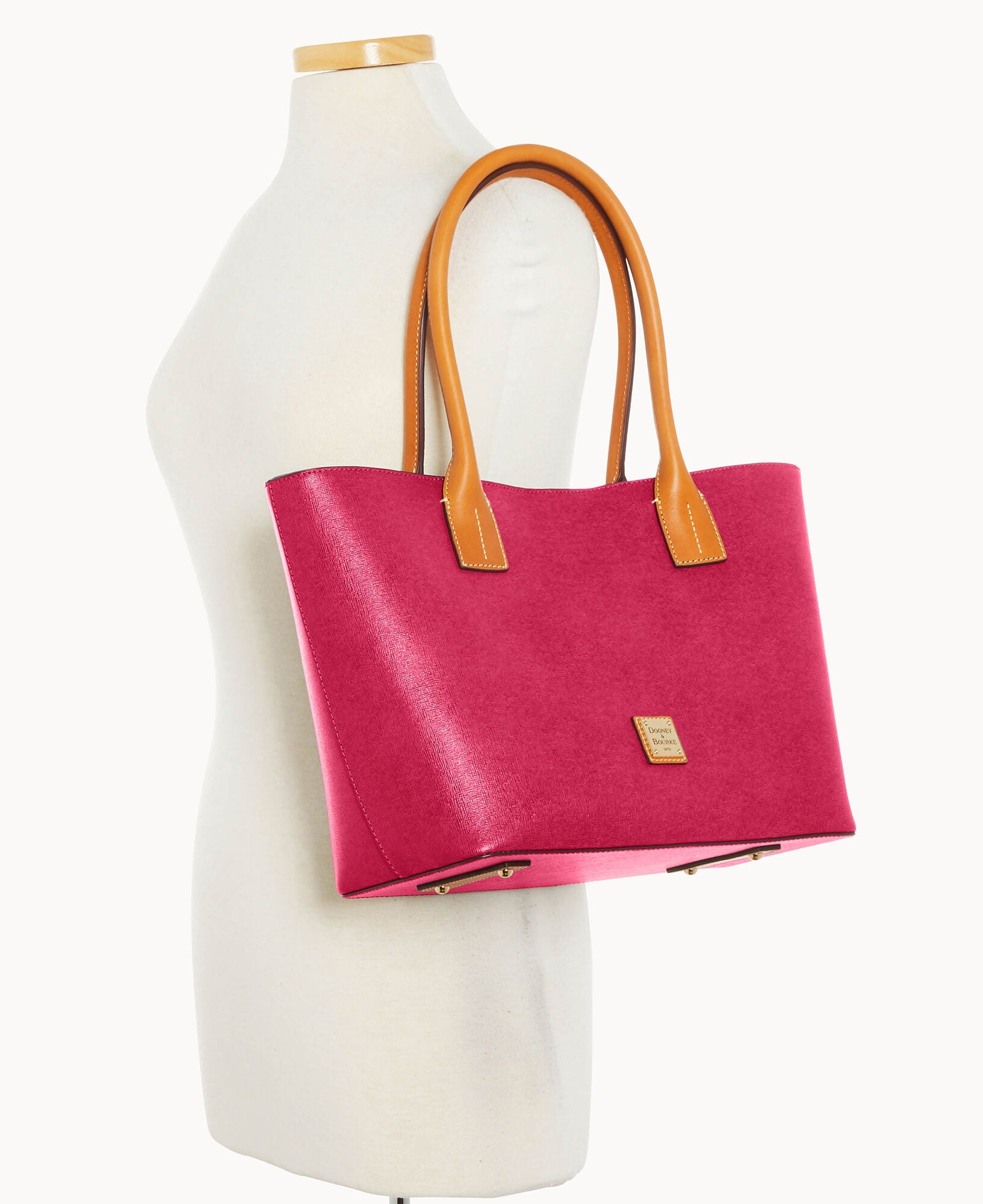 Outside zip pocket. One inside zip pocket. Two inside pockets. Cell phone pocket. Inside key hook. Handle drop length 8.5". Lined. Magnetic snap closure. Feet.