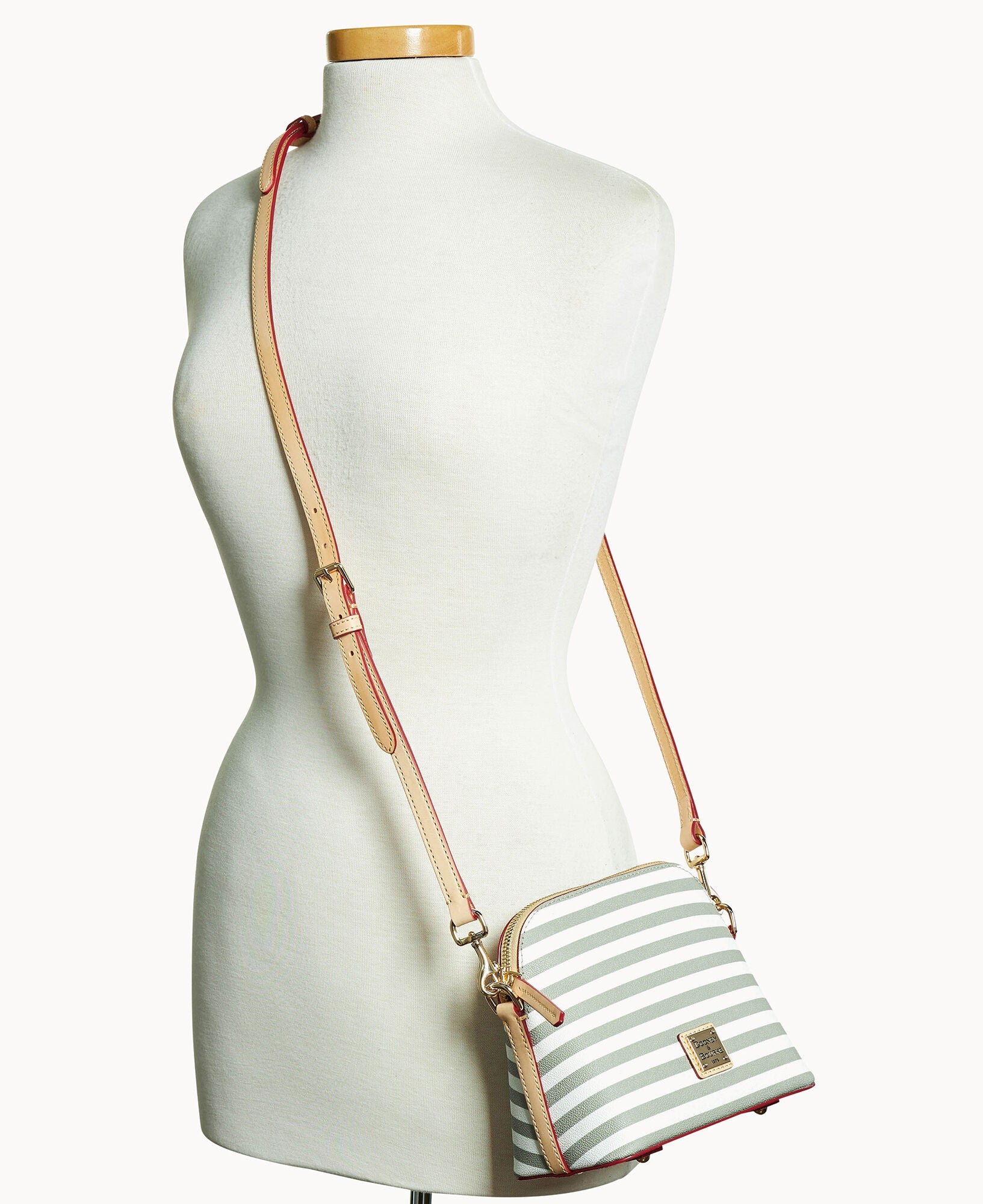 One outside zip pocket. One inside zip pocket. One inside pocket. Inside key hook. Adjustable shoulder strap. Strap drop length 23.75". Lined. Feet. Zipper closure.