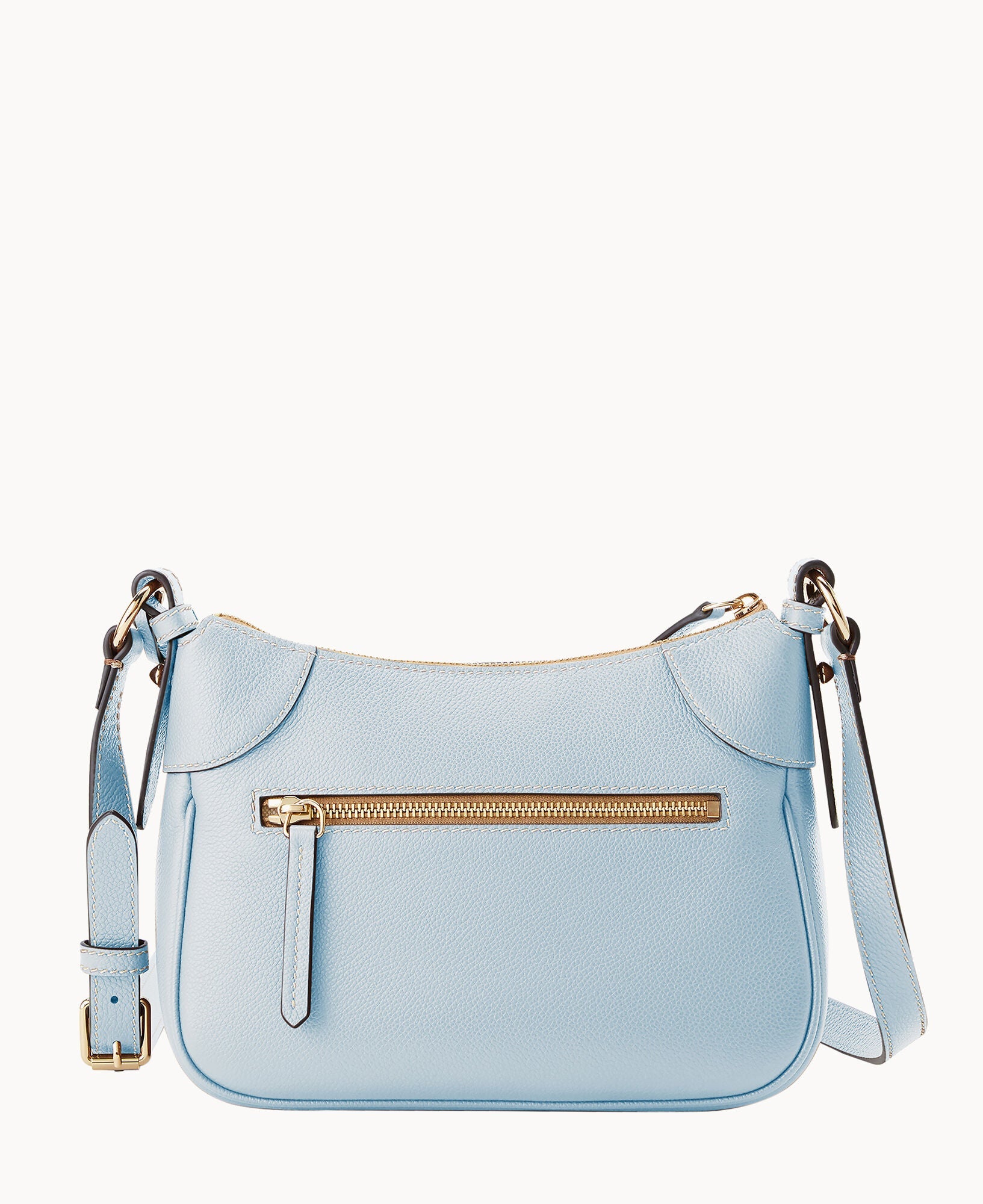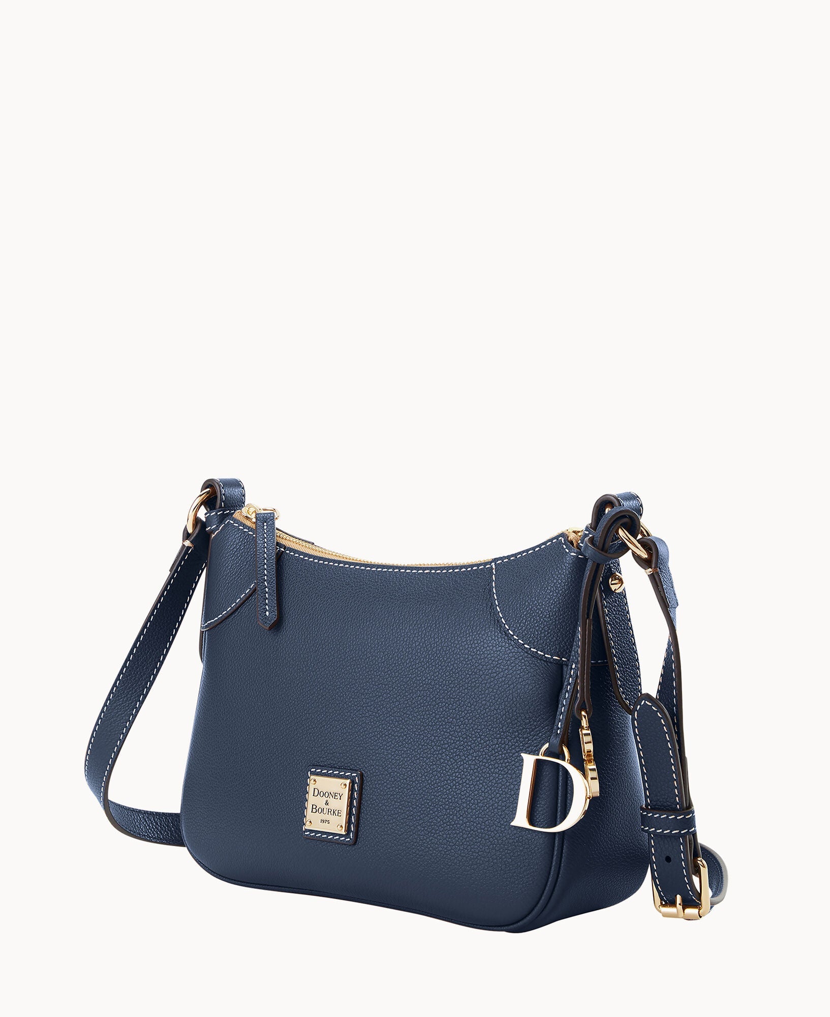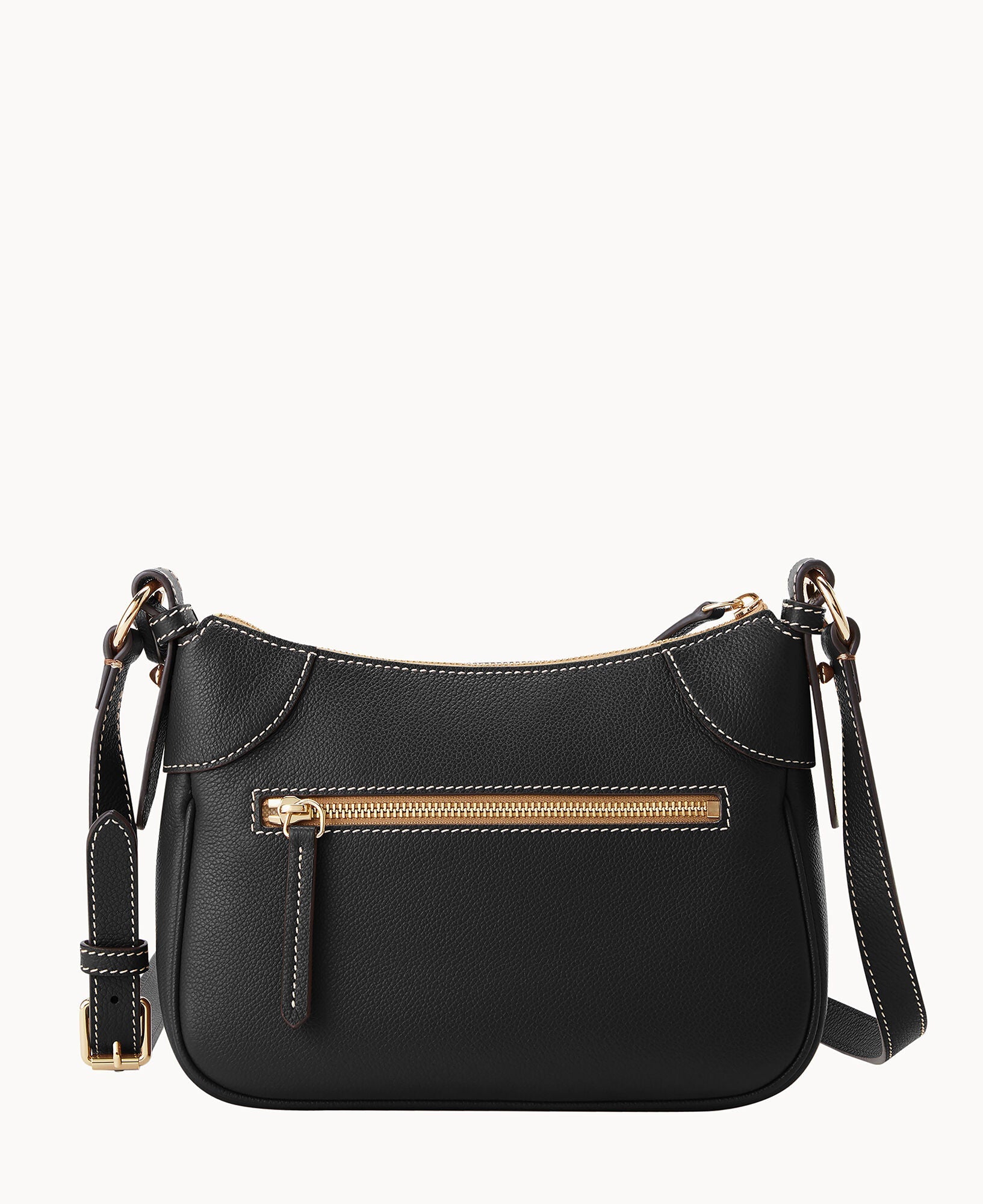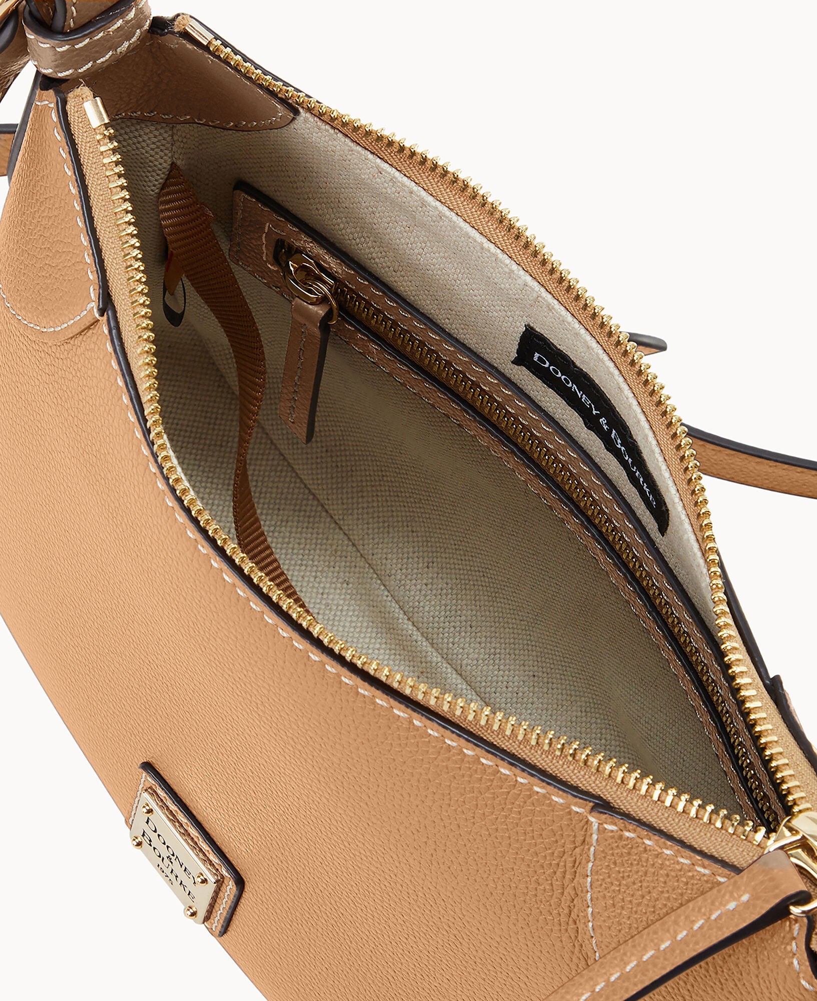 One outside zip pocket. One inside zip pocket. One inside pocket. Inside key hook. Strap drop length 24.5". Lined. Removable DB medallion. Zipper closure.