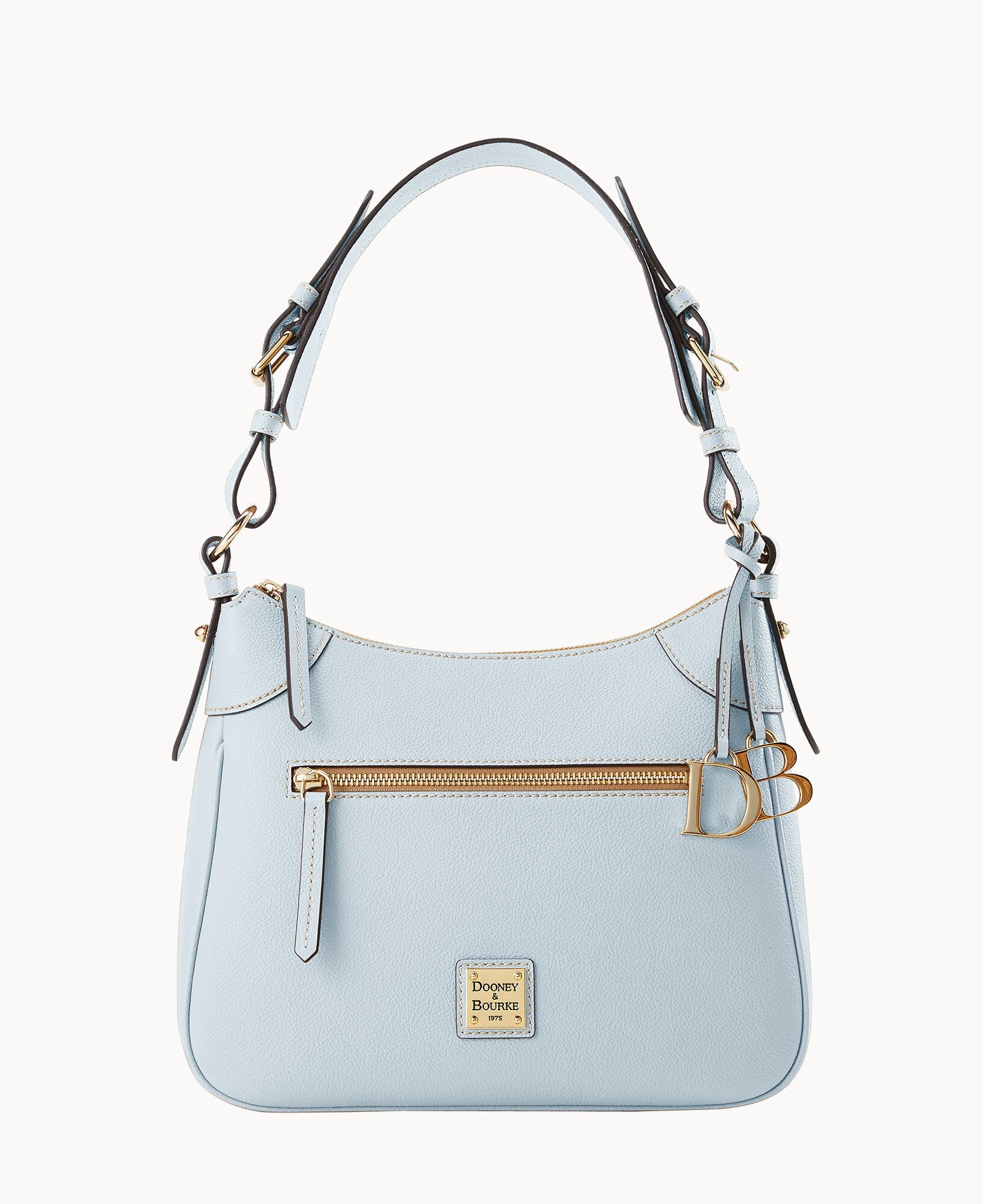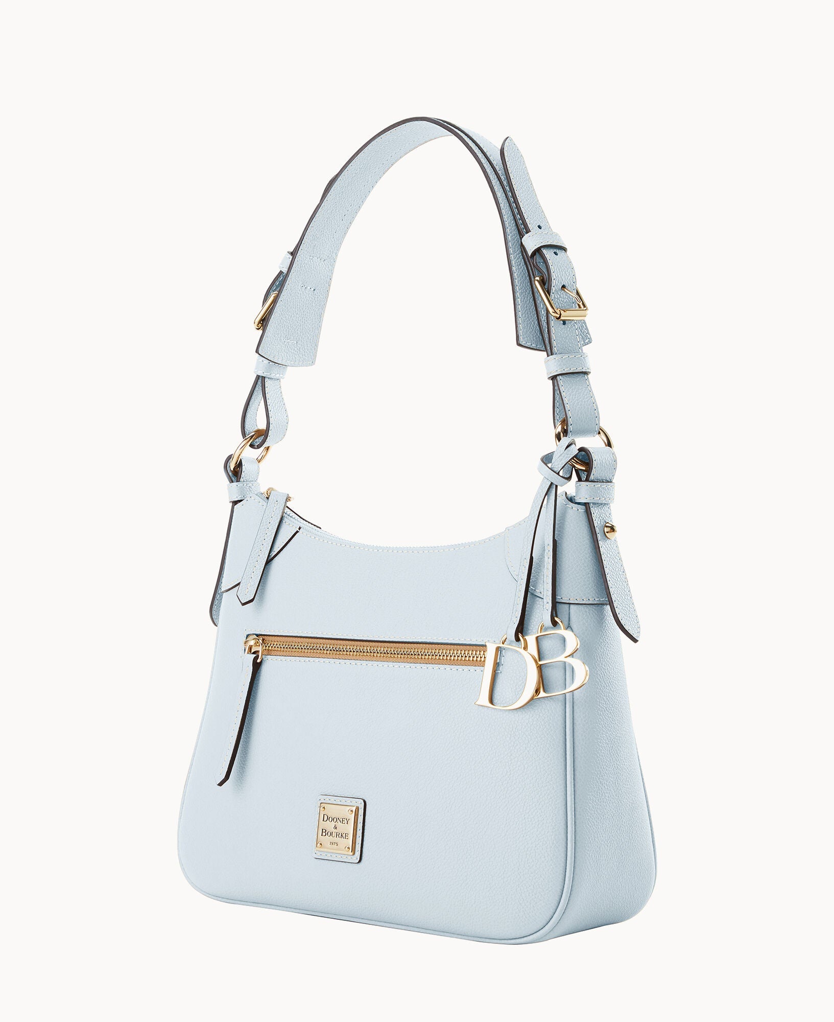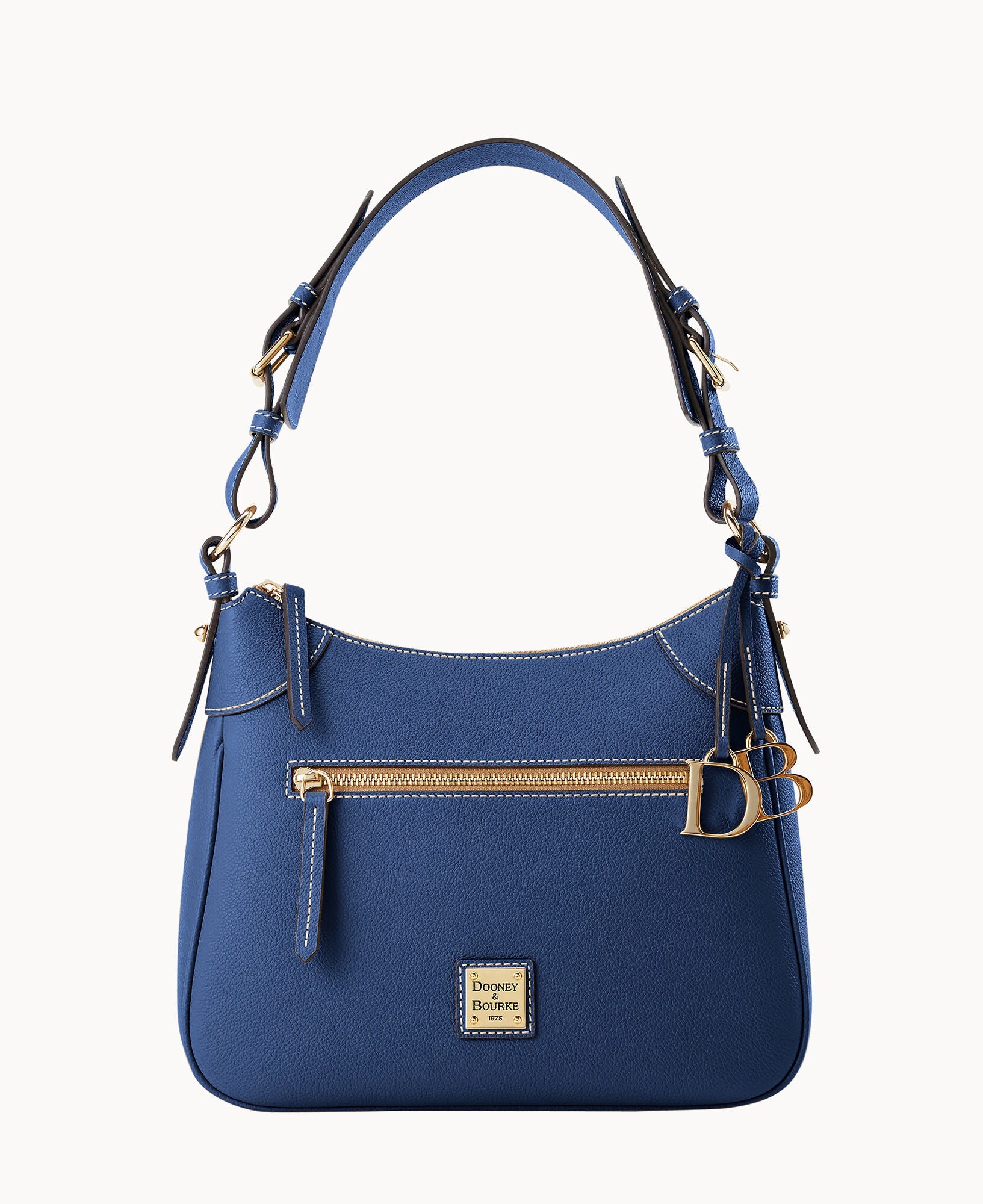 One outside zip pocket. One inside zip pocket. Two inside pockets. Cell phone pocket. Inside key hook. Strap drop length 9.5". Lined. Feet. Removable DB medallion. Zipper closure.