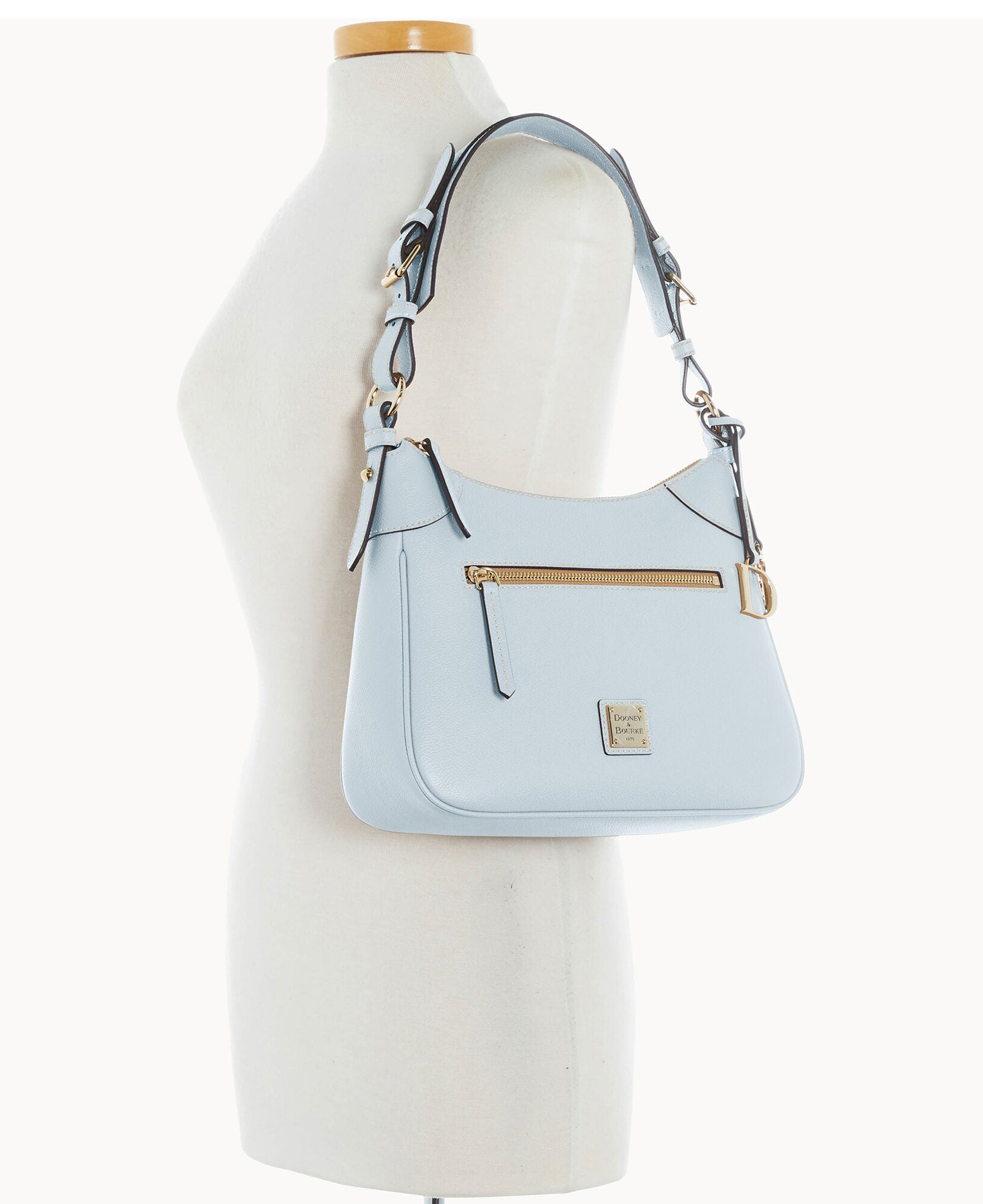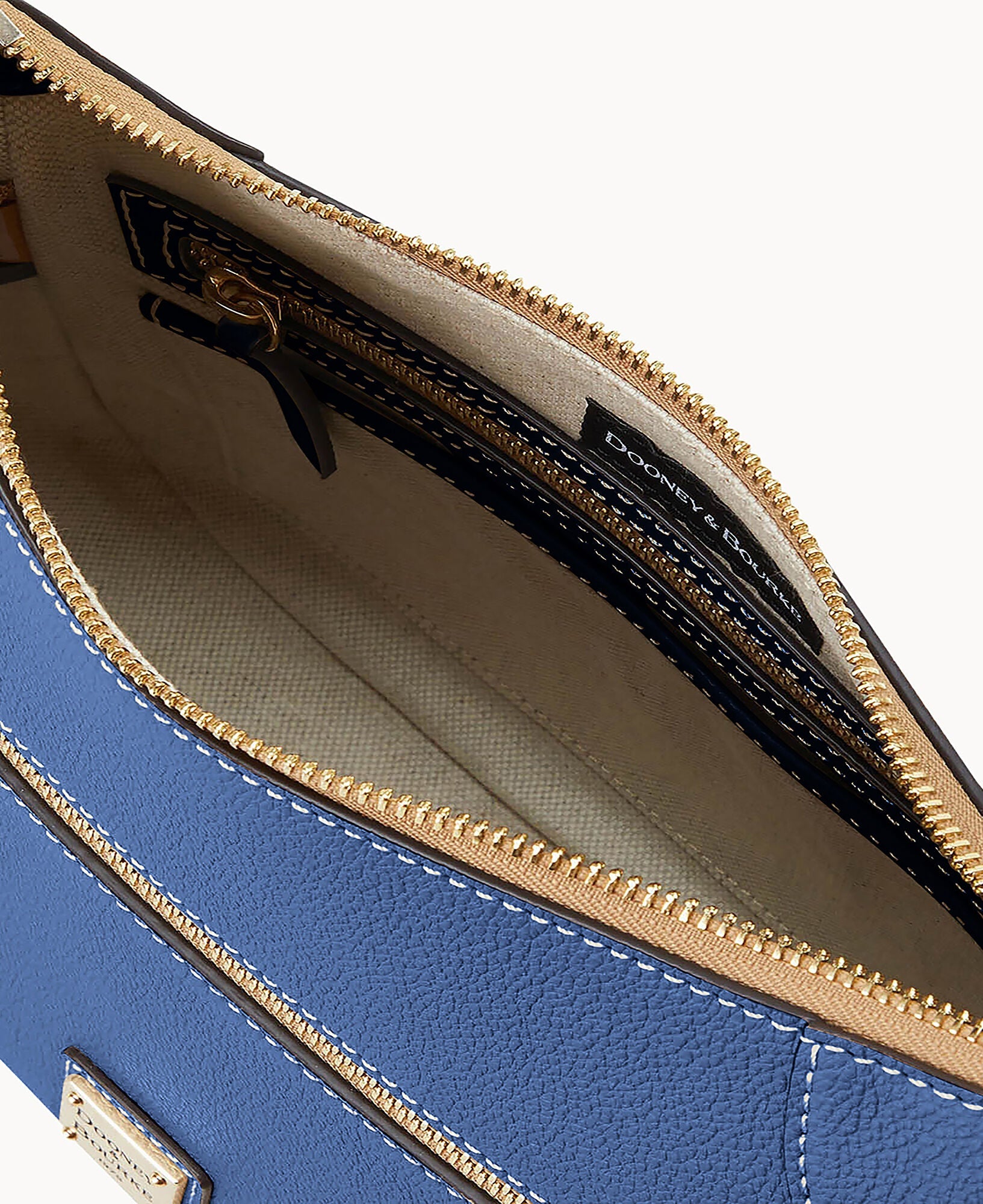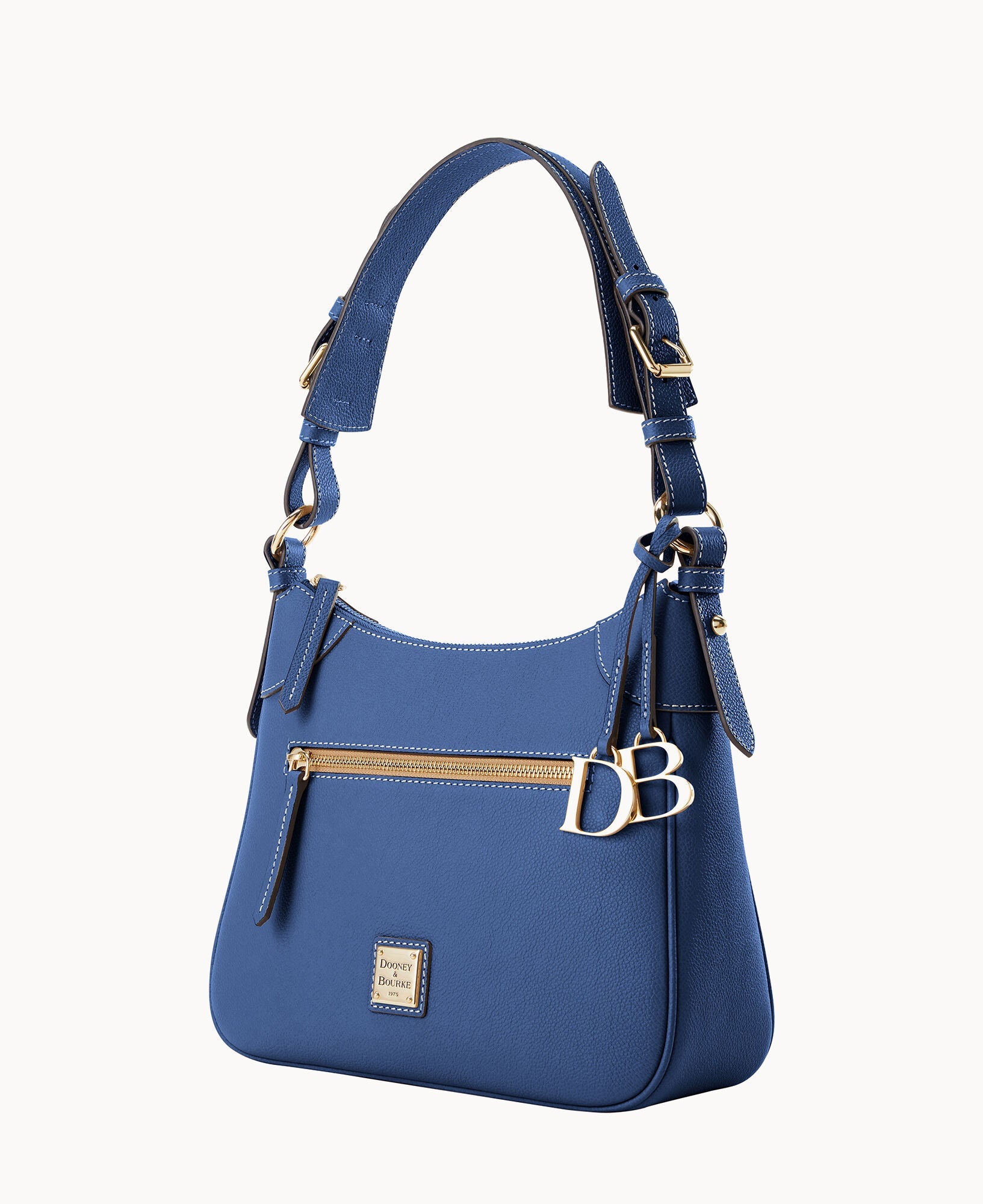 One outside zip pocket. One inside zip pocket. Two inside pockets. Cell phone pocket. Inside key hook. Strap drop length 9.5". Lined. Feet. Removable DB medallion. Zipper closure.