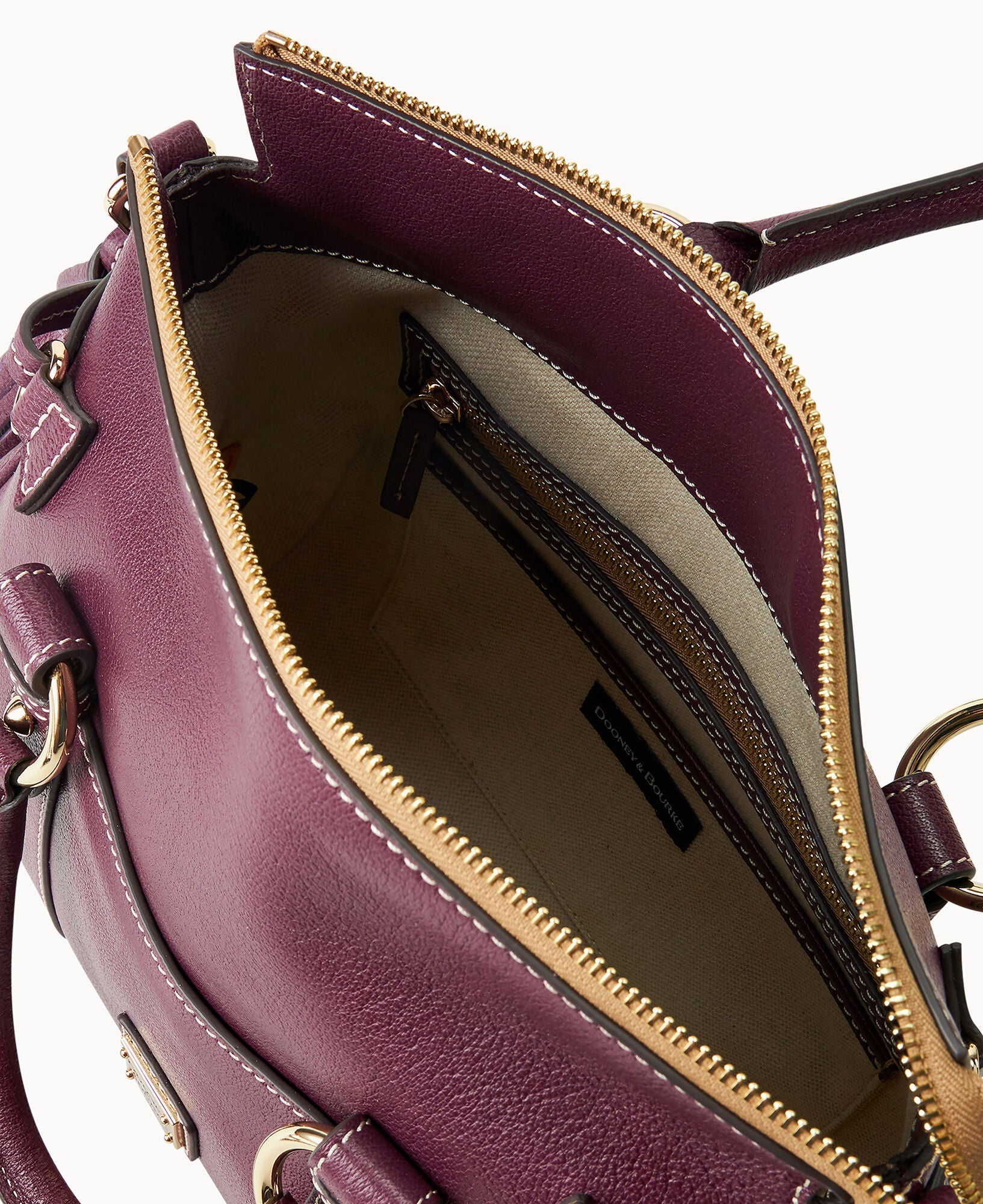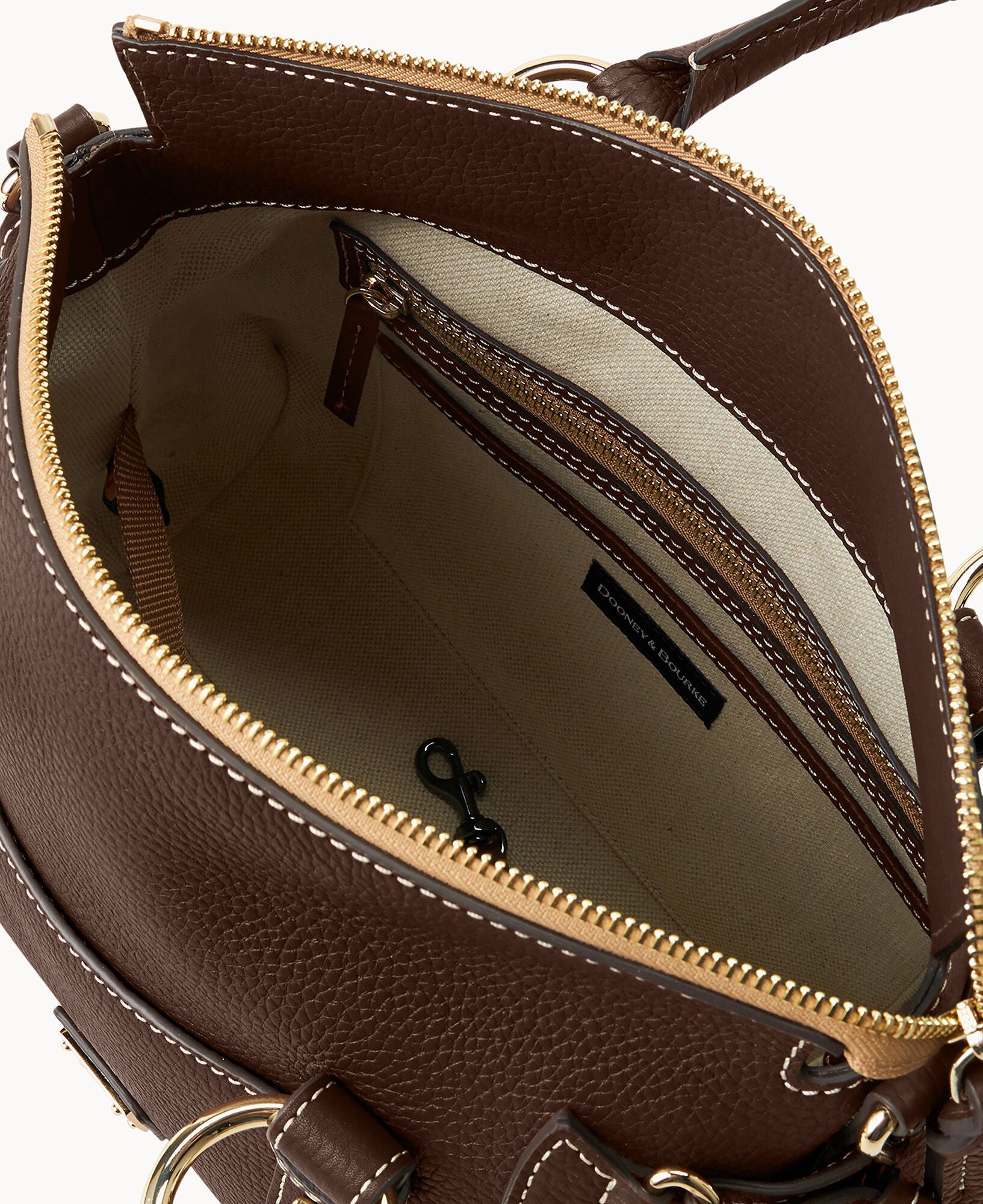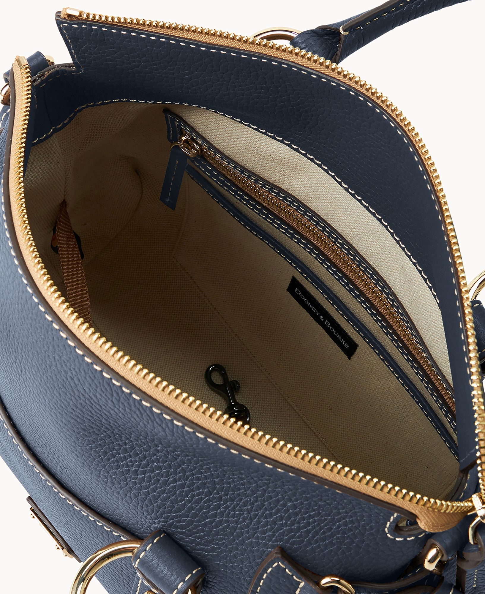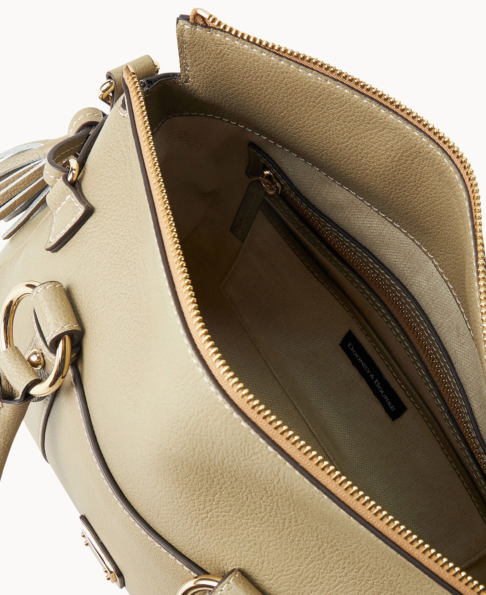 Two outside pockets. One inside zip pocket. Two inside pocket. Cell phone pocket. Inside key hook. Feet. Lined. Zipper closure. Adjustable, detachable shoulder strap. Strap drop length 22". Handle drop length 5".