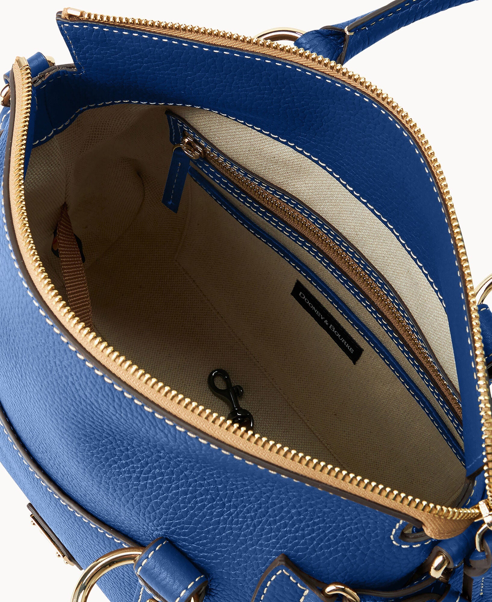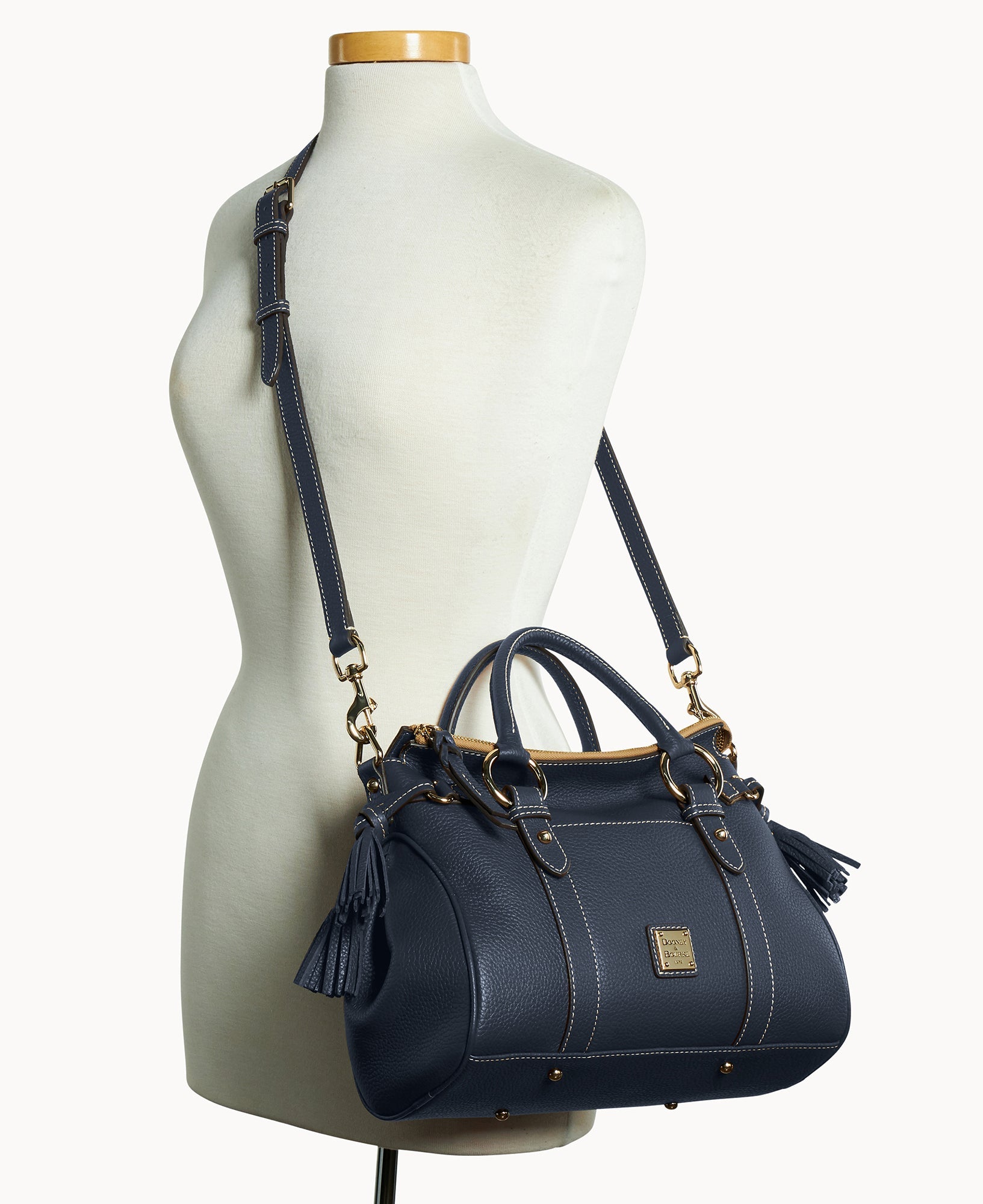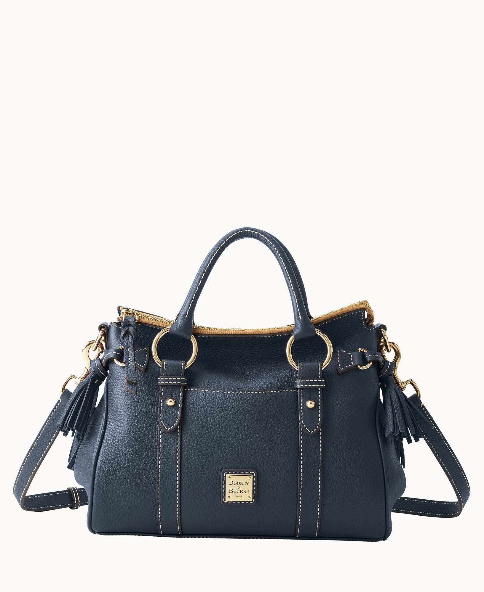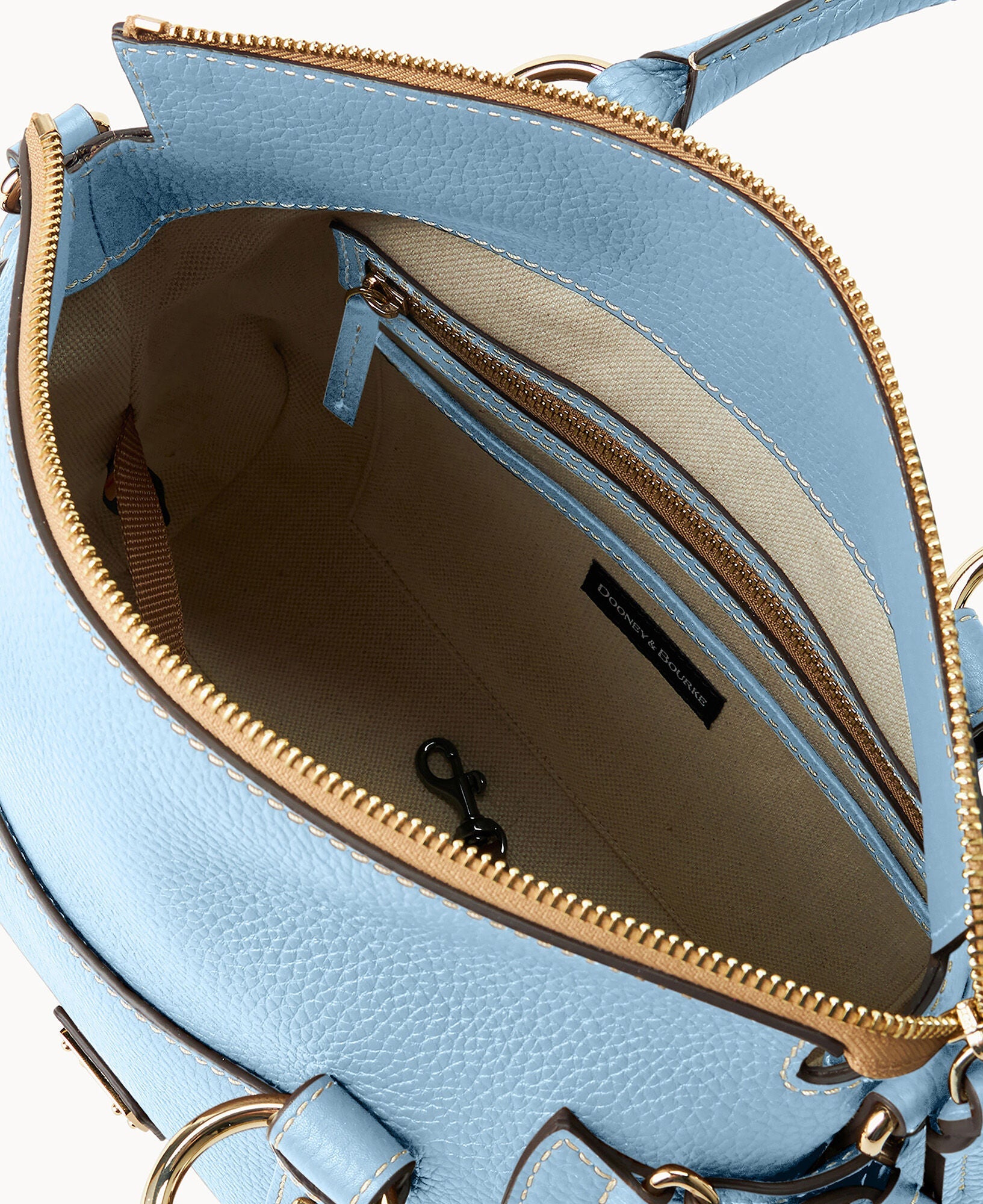 Two outside pockets. One inside zip pocket. Two inside pocket. Cell phone pocket. Inside key hook. Feet. Lined. Zipper closure. Adjustable, detachable shoulder strap. Strap drop length 22". Handle drop length 5".