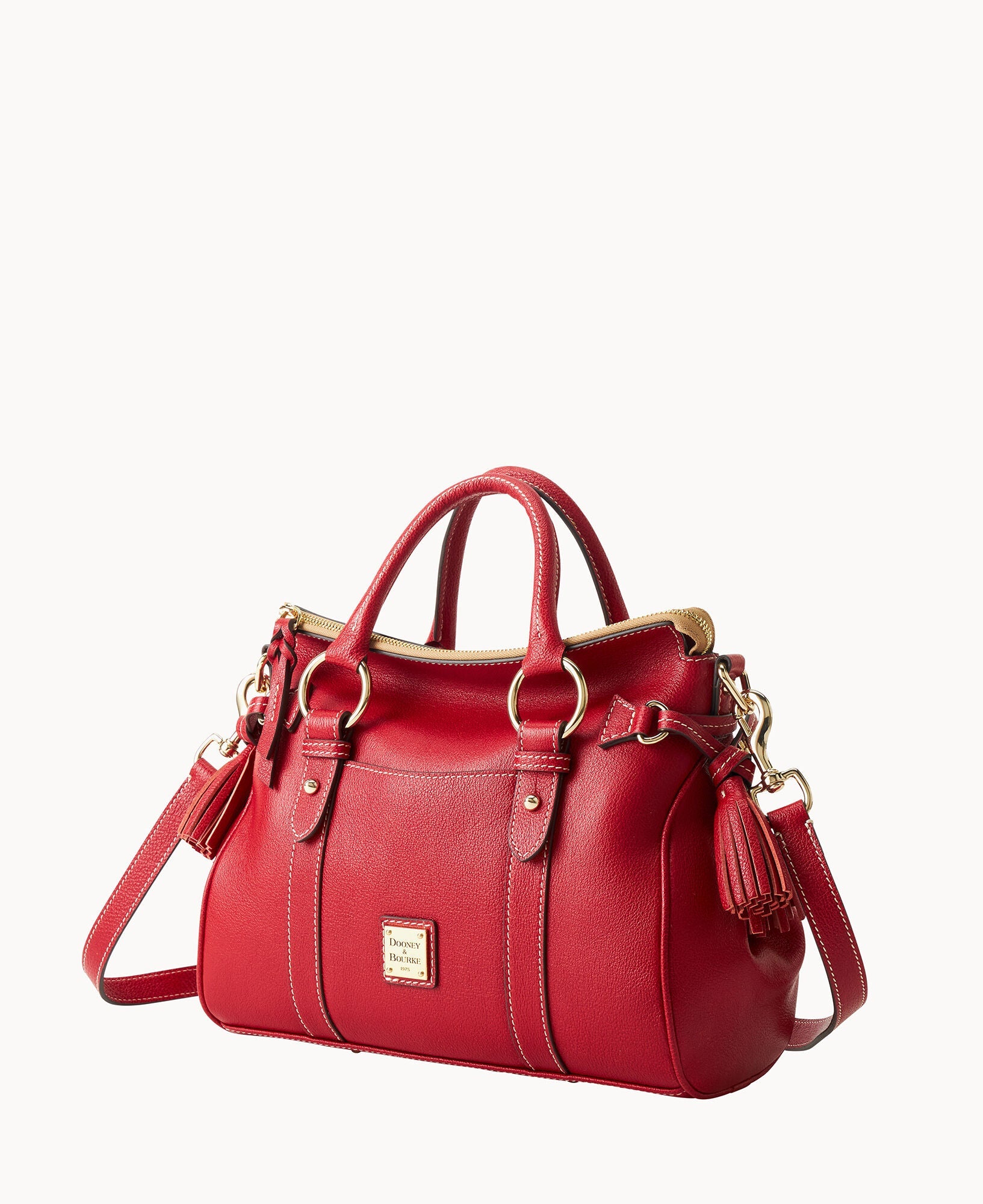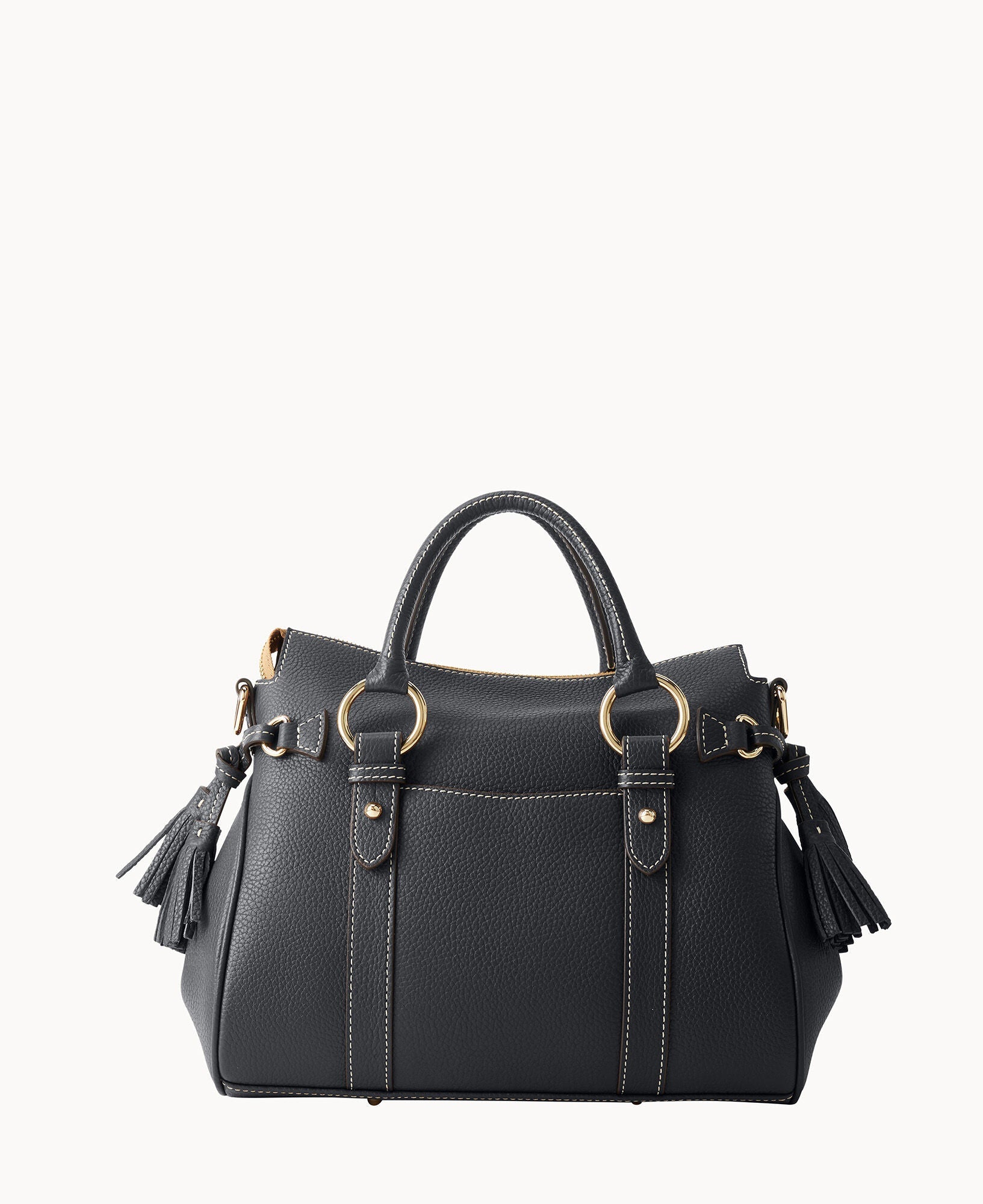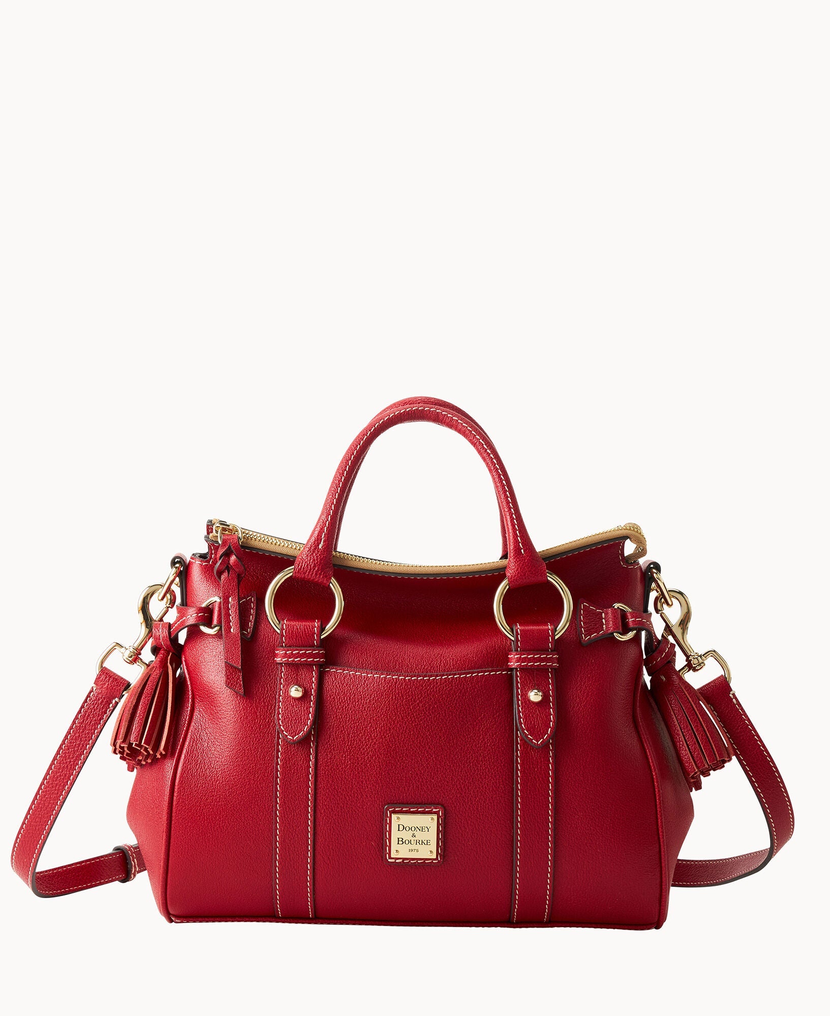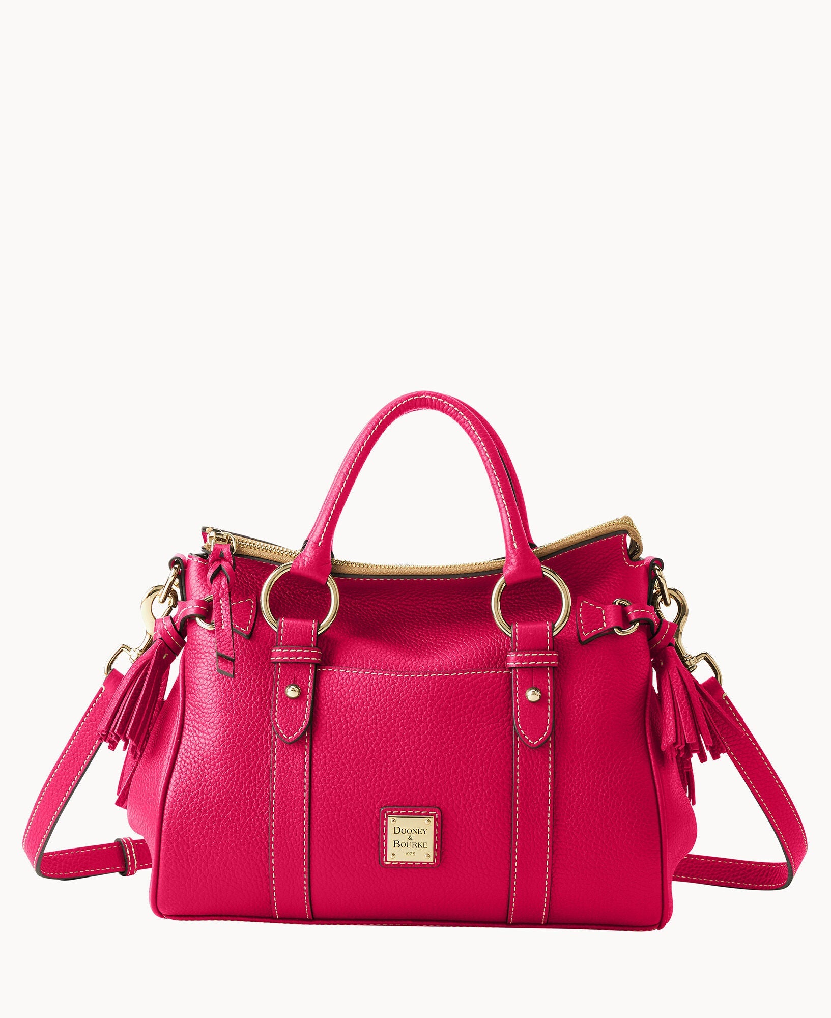 Two outside pockets. One inside zip pocket. Two inside pocket. Cell phone pocket. Inside key hook. Feet. Lined. Zipper closure. Adjustable, detachable shoulder strap. Strap drop length 22". Handle drop length 5".