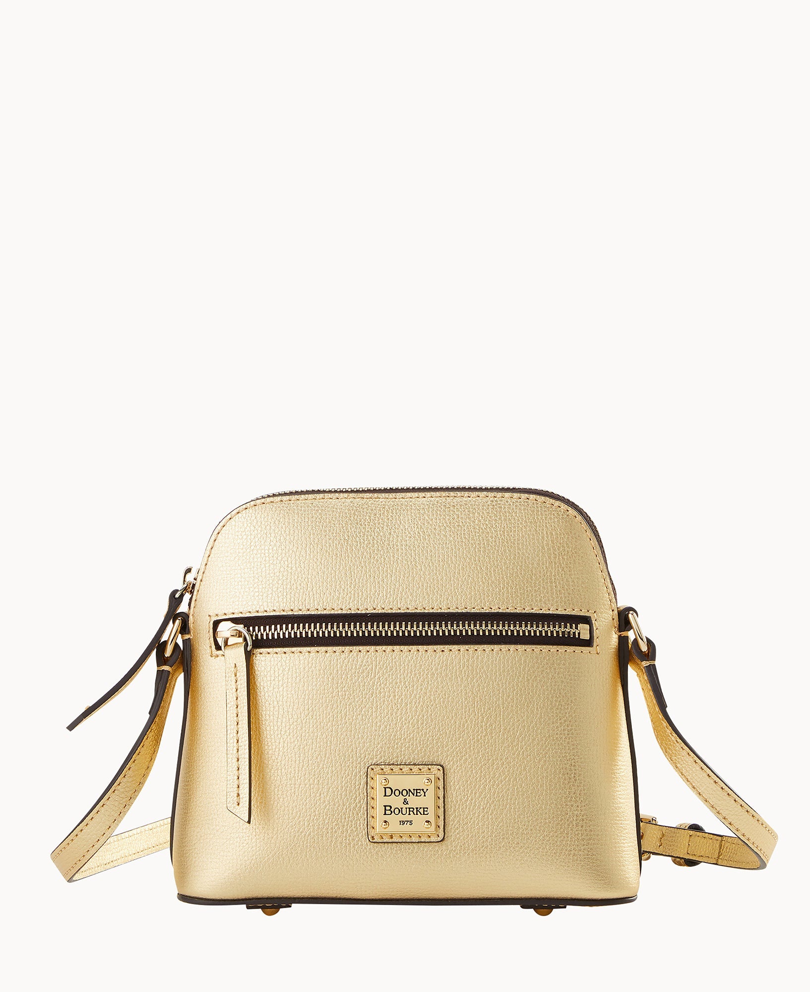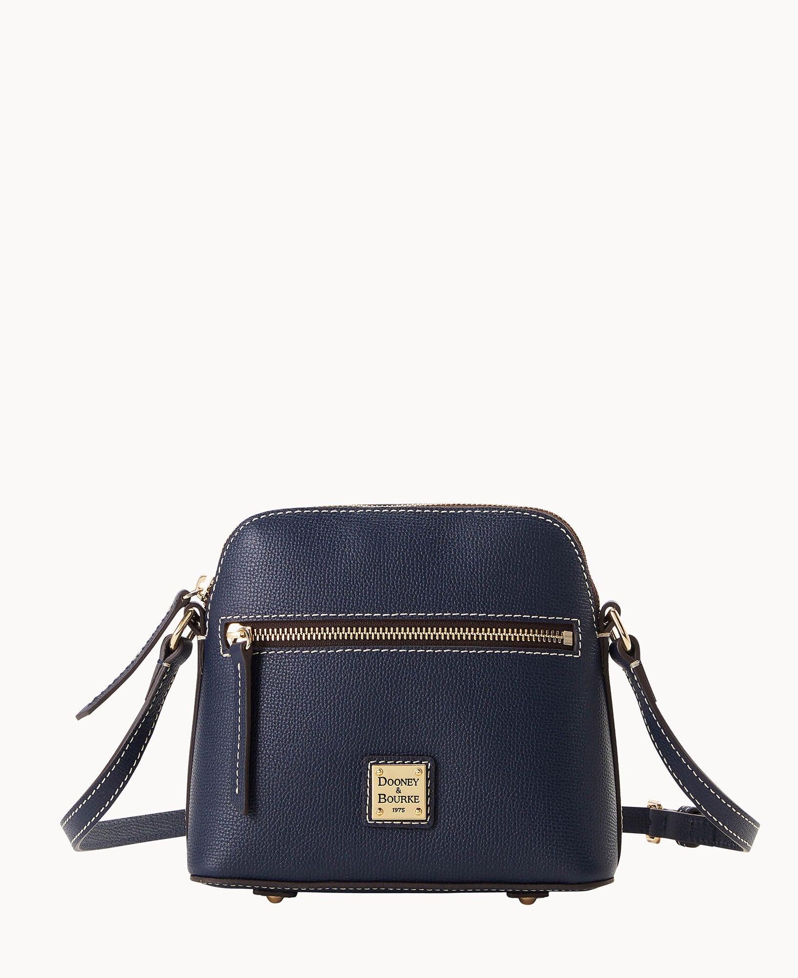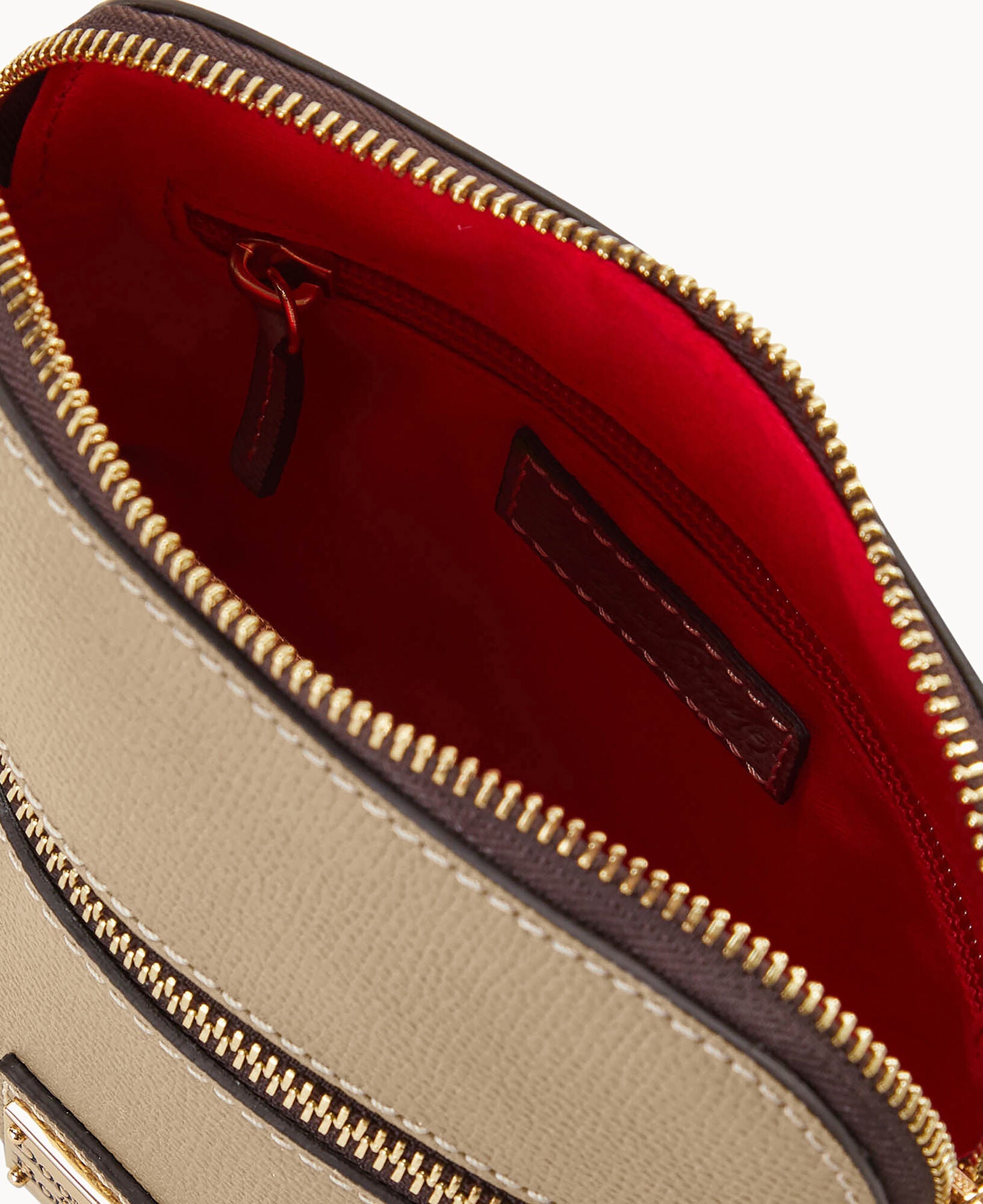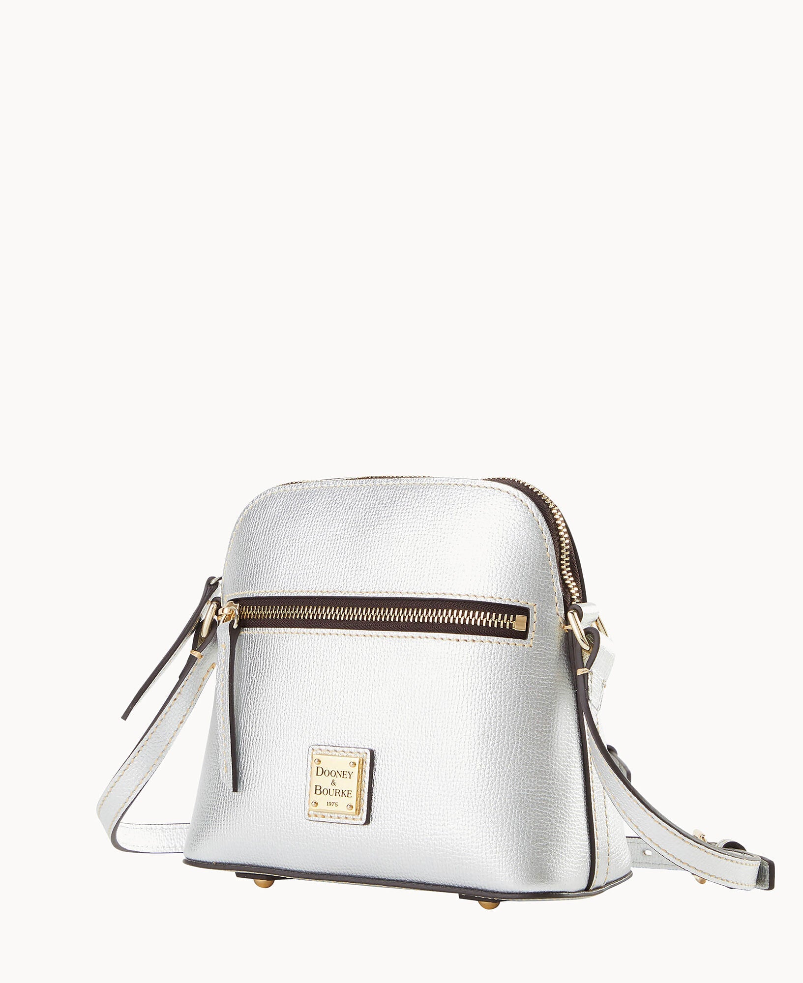 One outside zip pocket. One inside zip pocket. One inside pocket. Inside key hook. Adjustable shoulder strap. Strap drop length 23". Lined. Feet.
