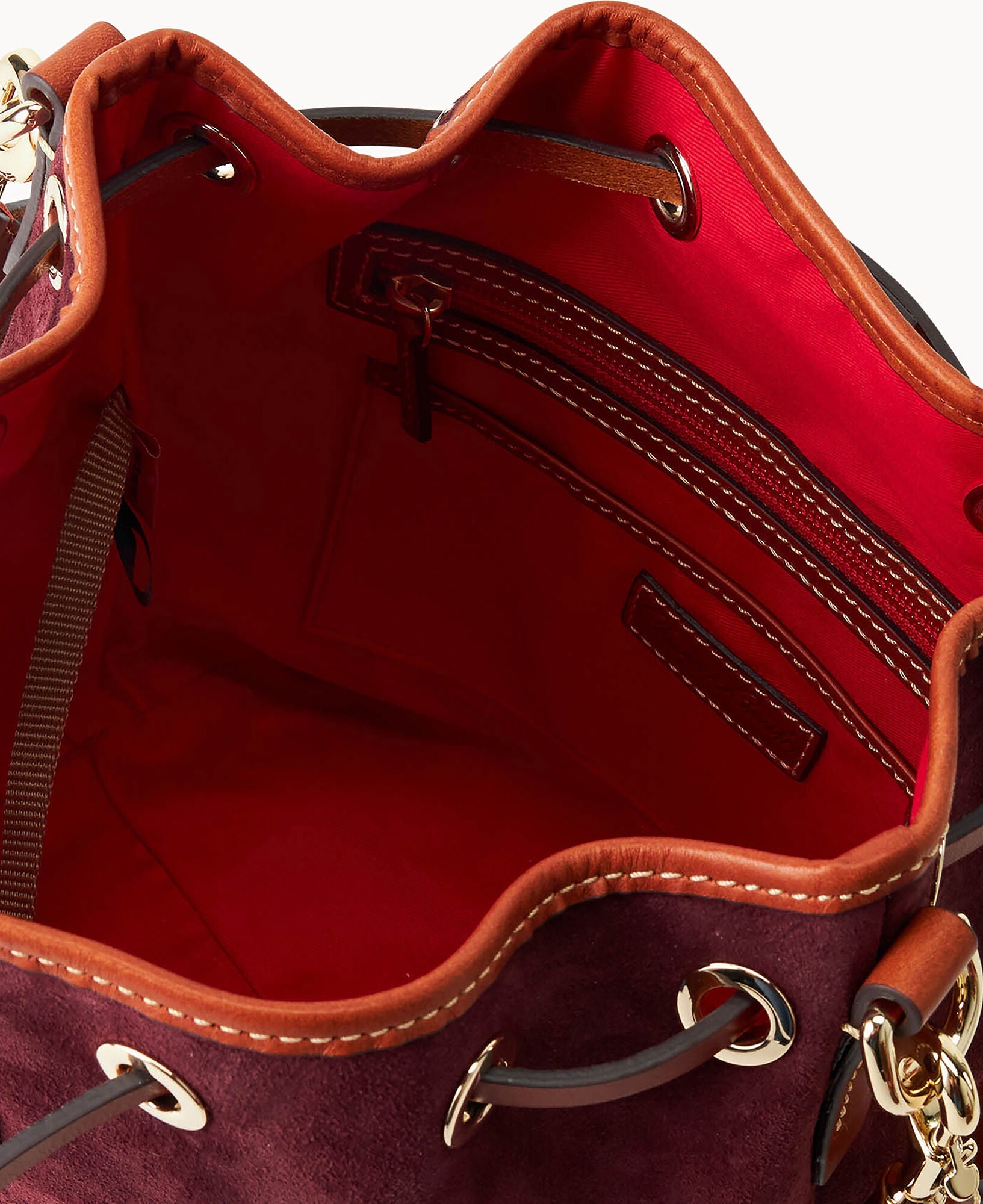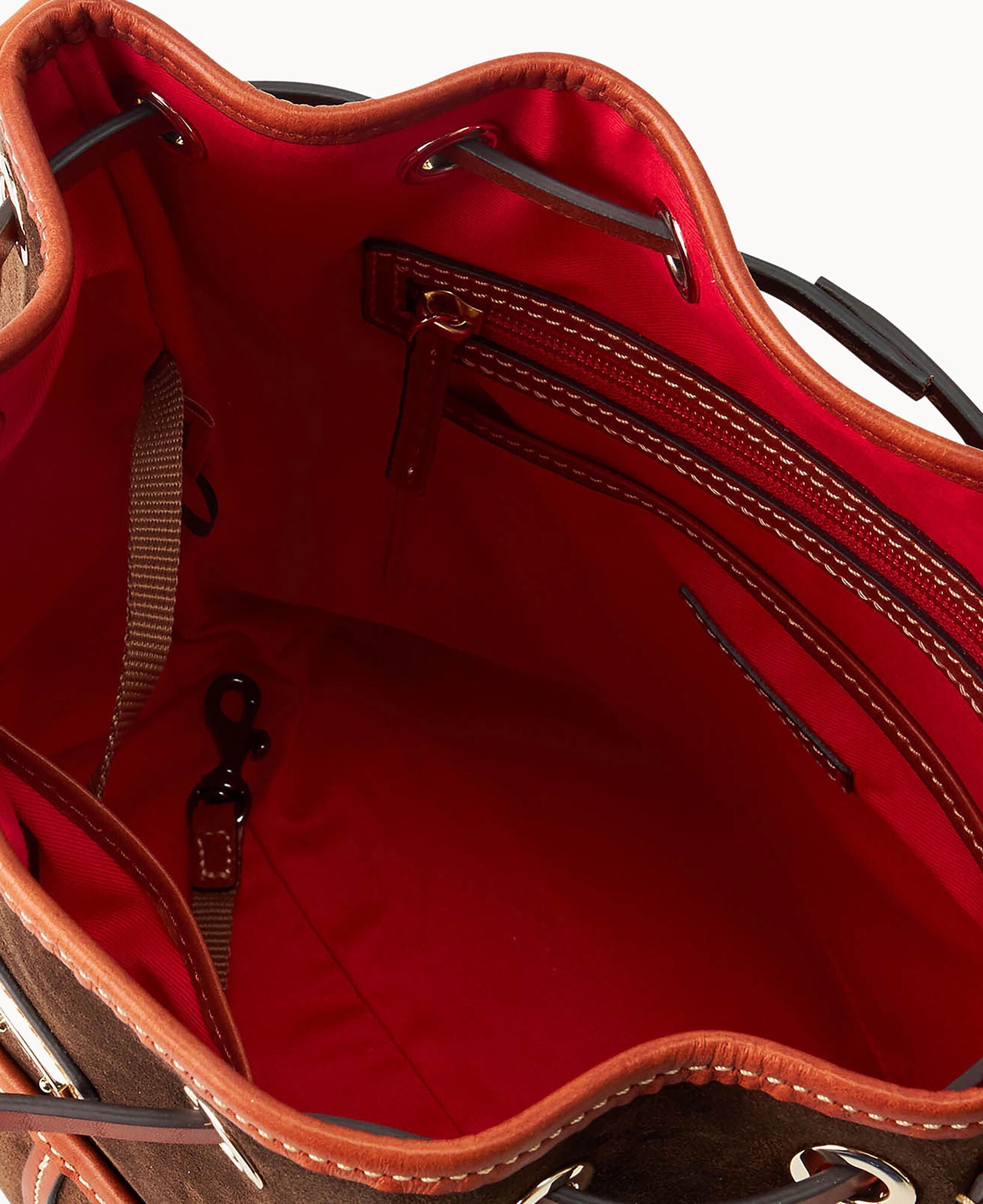Two outside pockets. Two inside pockets. One inside pocket. Inside key hook. Detachable strap. Drawstring closure.