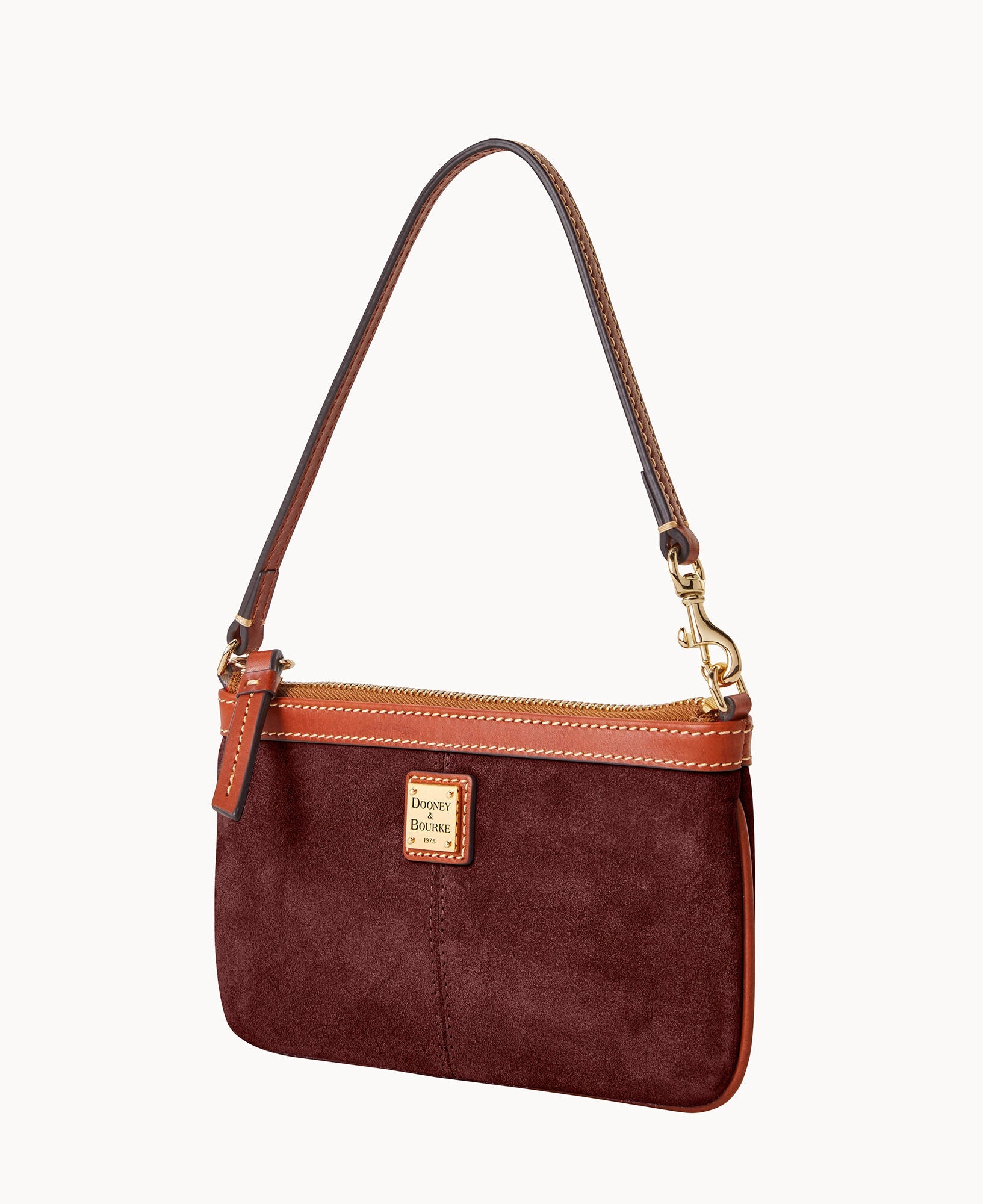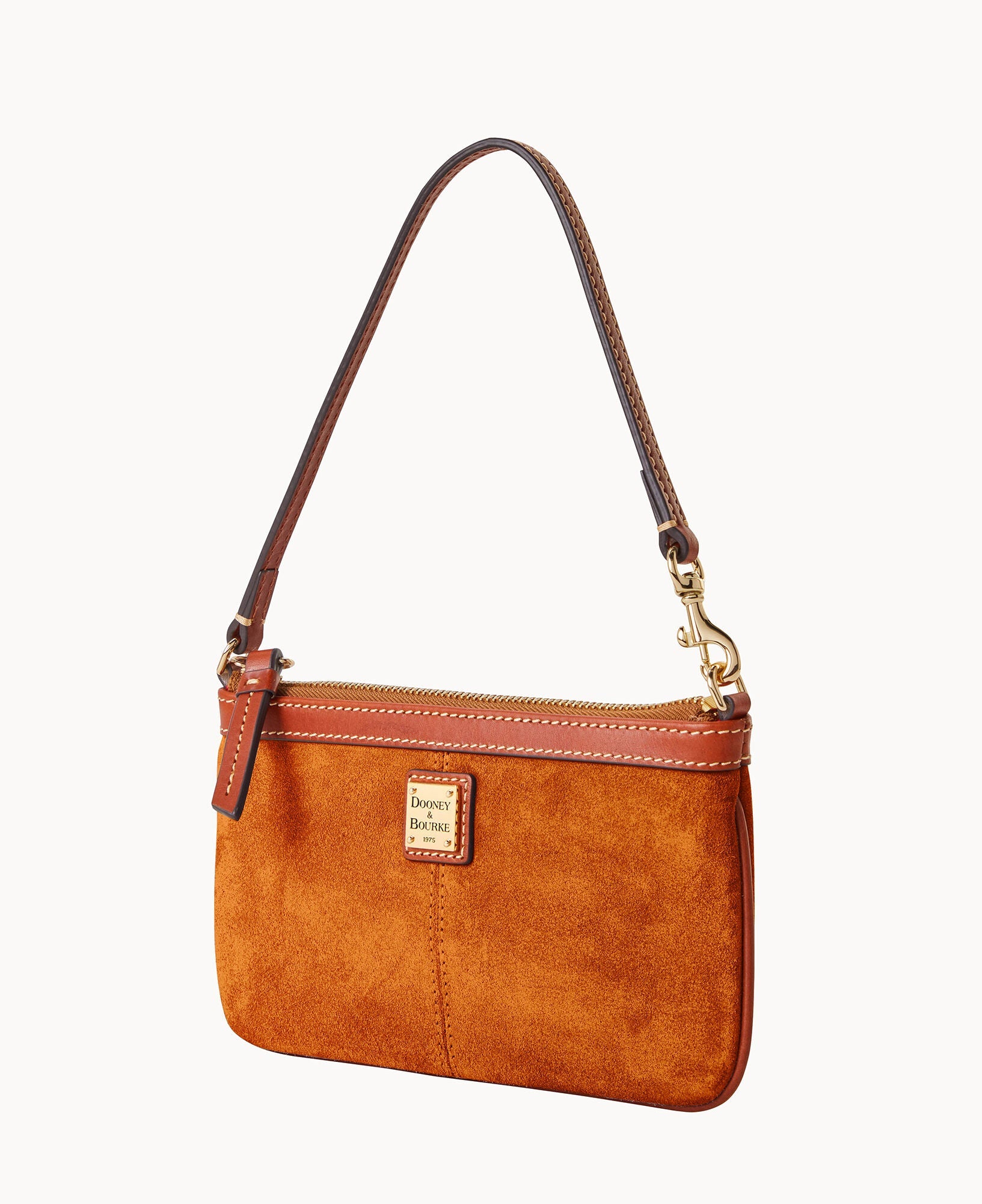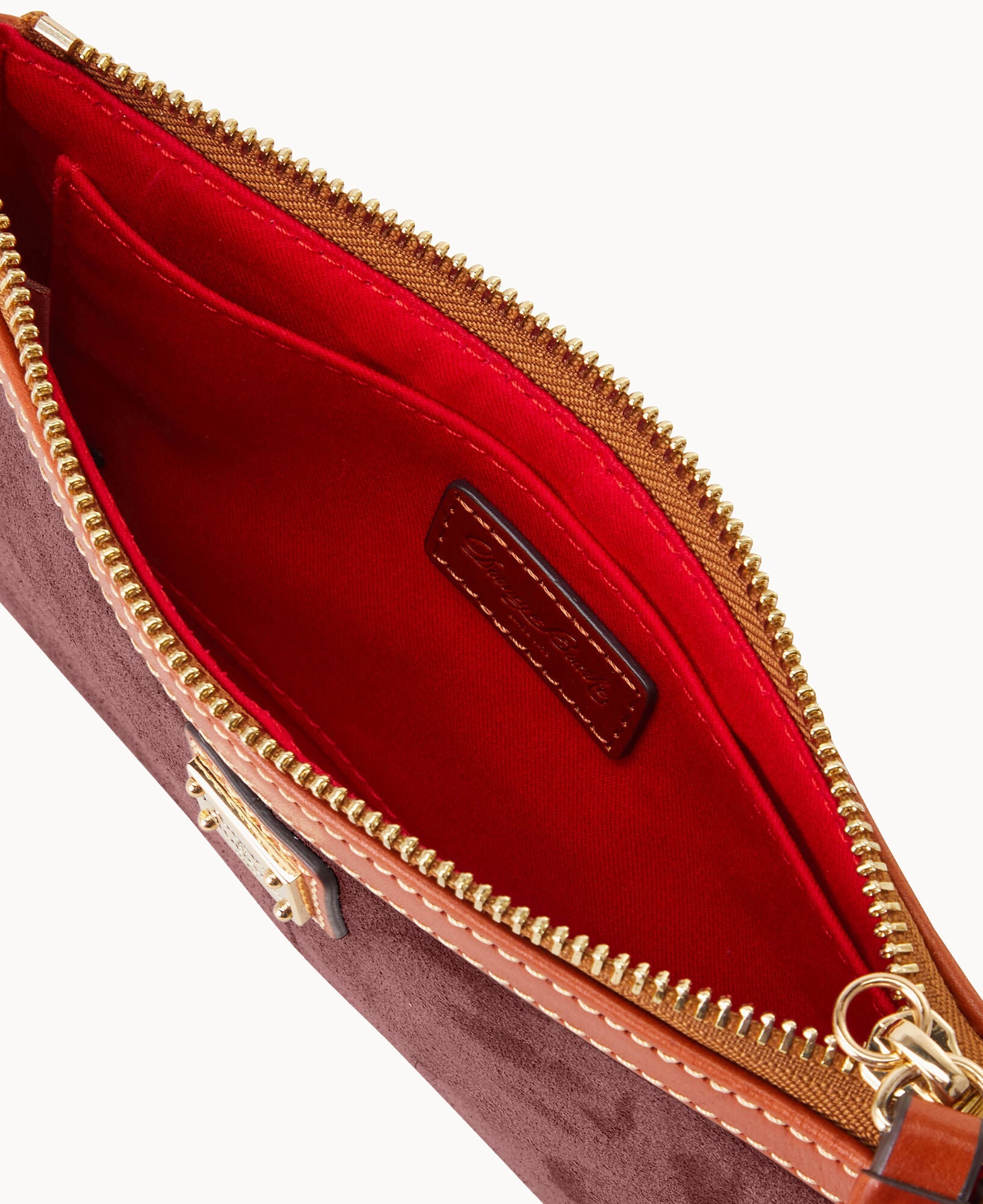 One inside pocket. Adjustable wrist strap. Strap drop length 3". Lined. Zipper closure.