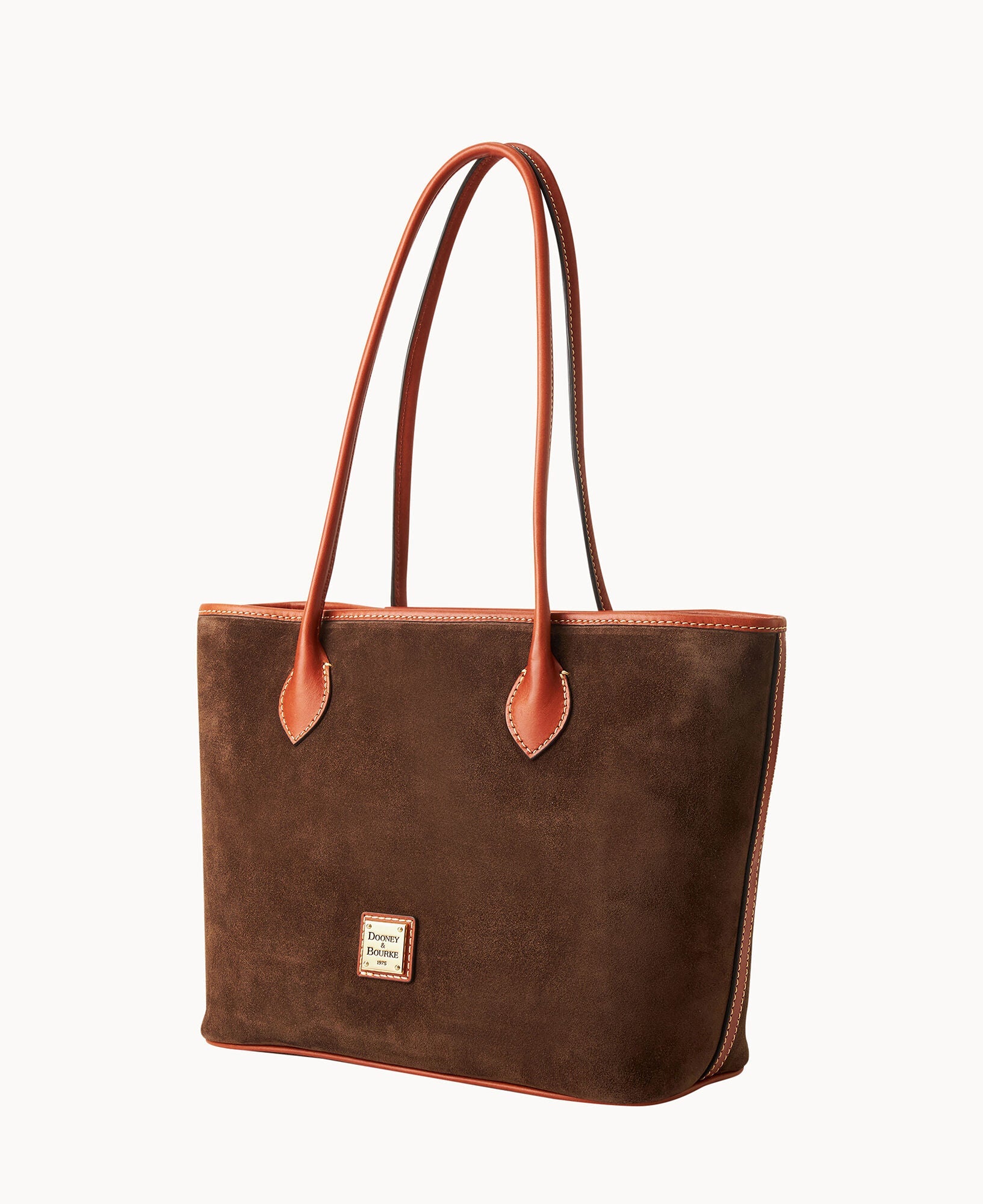 One outside zip pocket. One inside zip pocket. Two inside pockets. Cell phone pocket. Inside key hook. Strap drop length 10". Lined. Feet. Zipper closure.