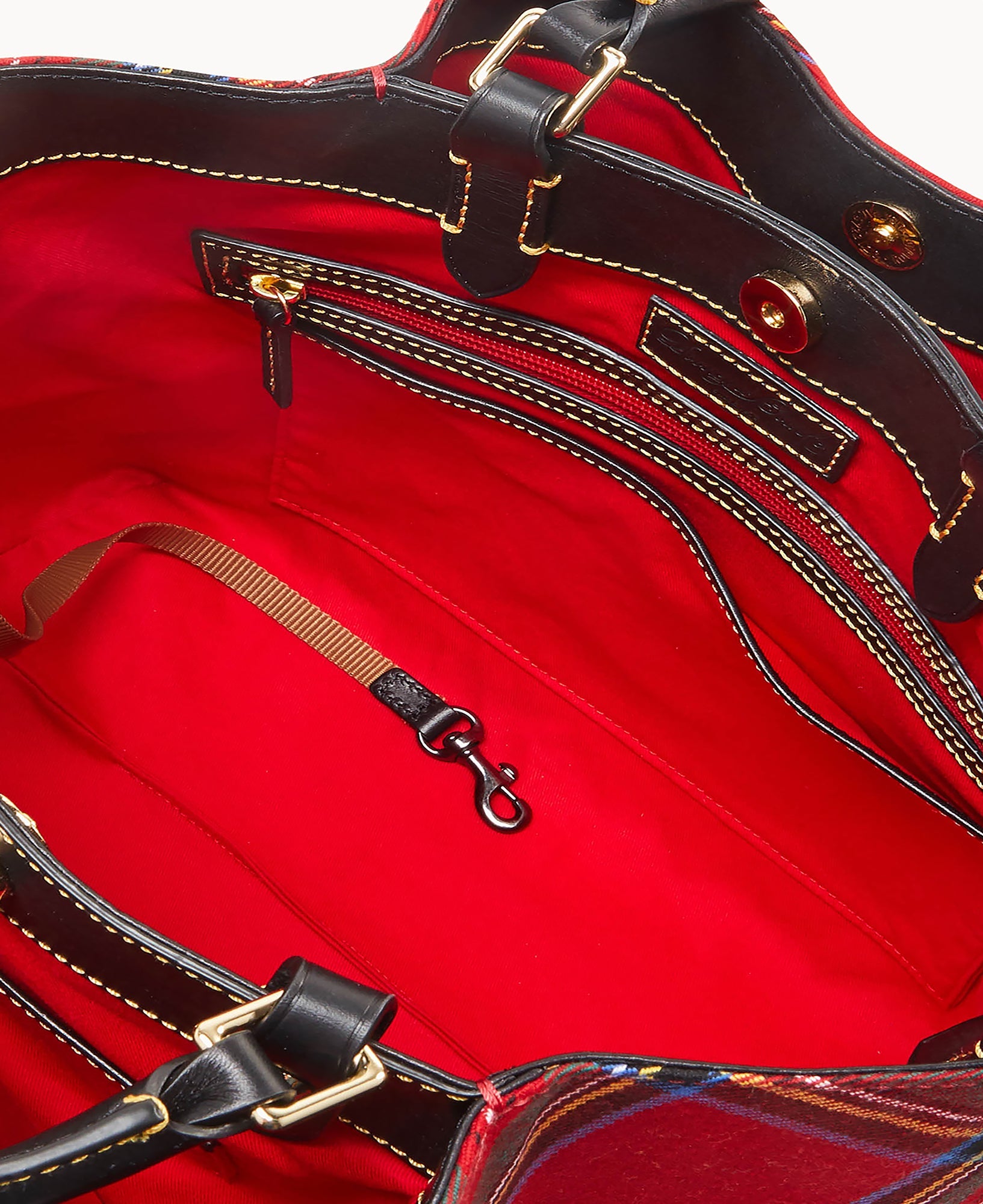 Inside center zip compartment. One inside zip pocket. One inside credit card slot. Two inside pockets. Cell phone pocket. Inside key hook. Adjustable strap. Handle drop length 5". Strap drop length 25". Lined. Magnetic closure. Feet.