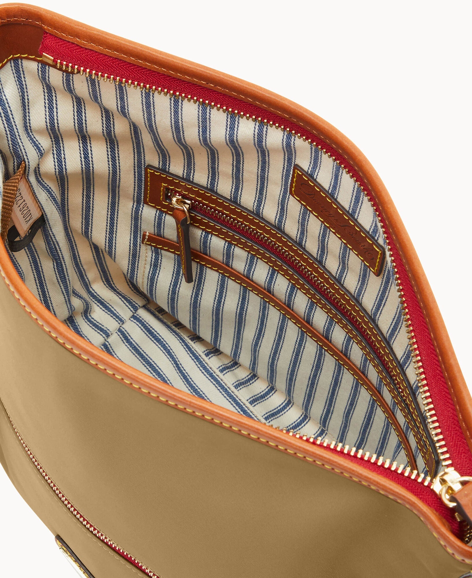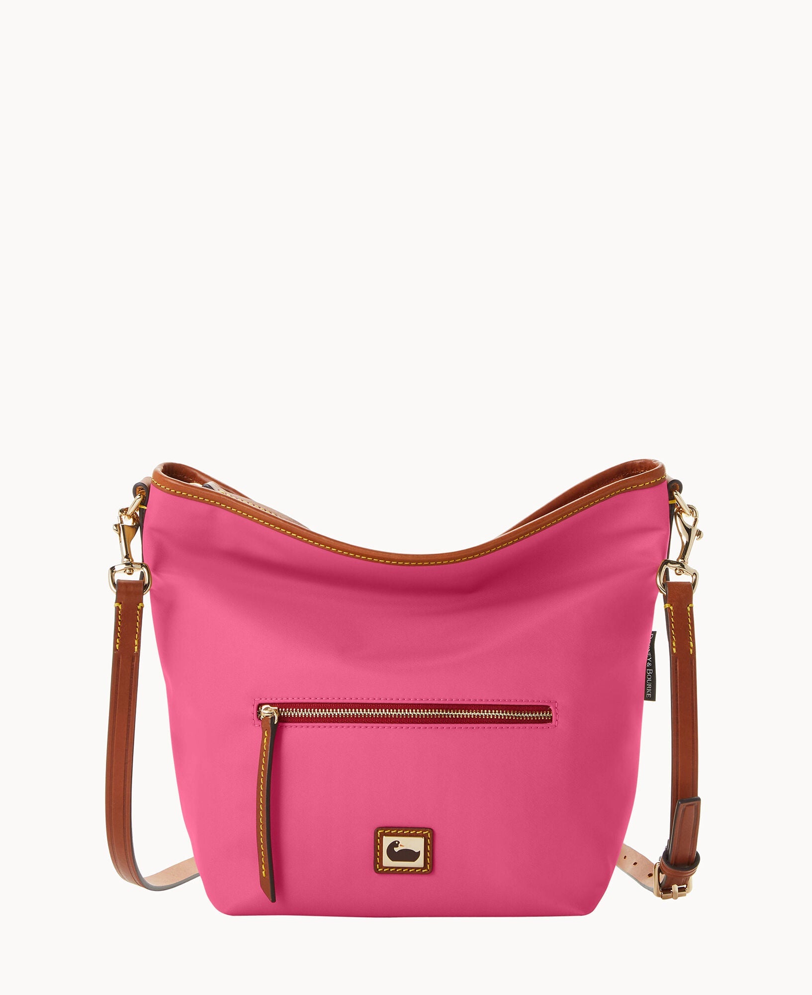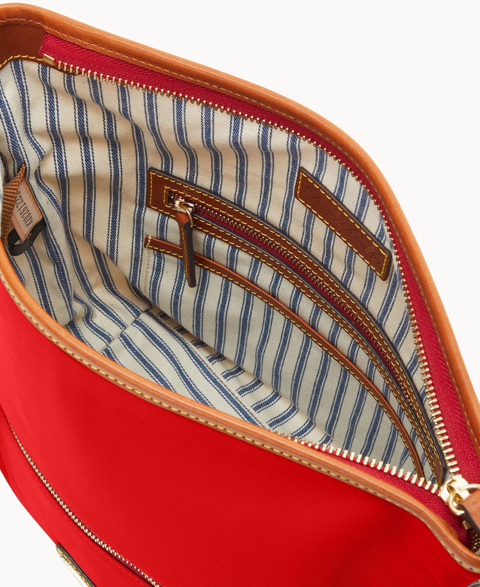 One outside zip pocket. One inside zip pocket. Two inside pockets. Cell phone pocket. Inside key hook. Adjustable, detachable shoulder strap. Feet. Zipper closure.