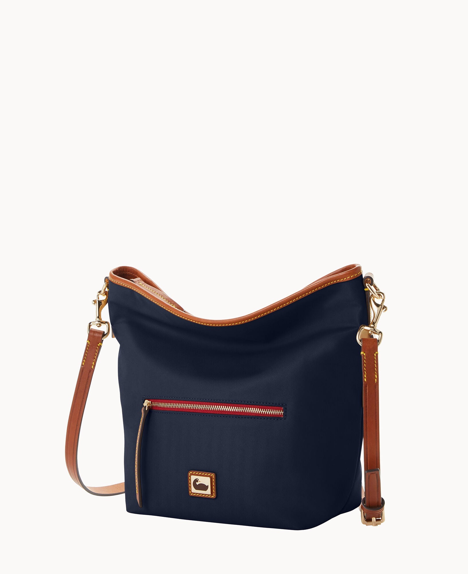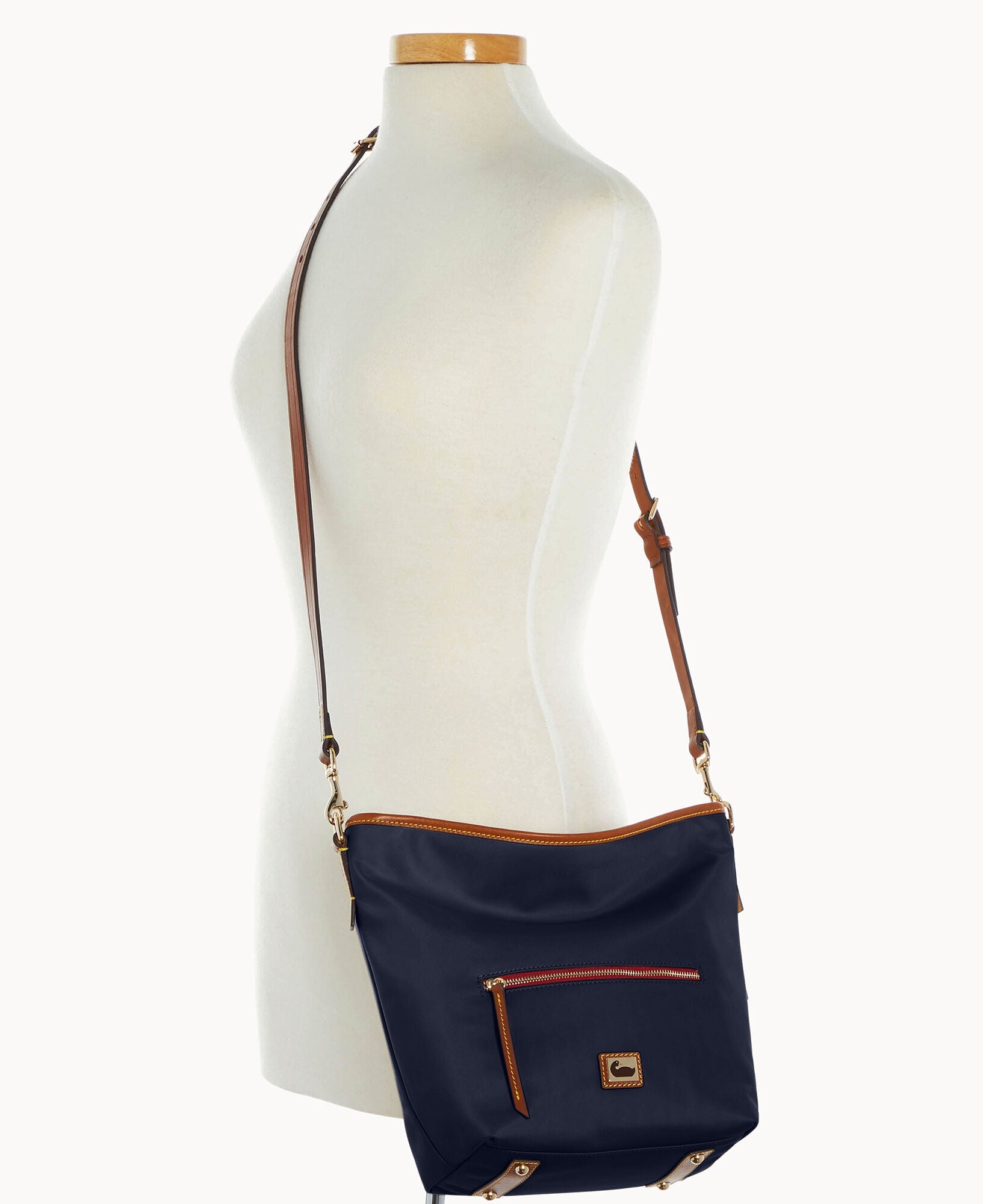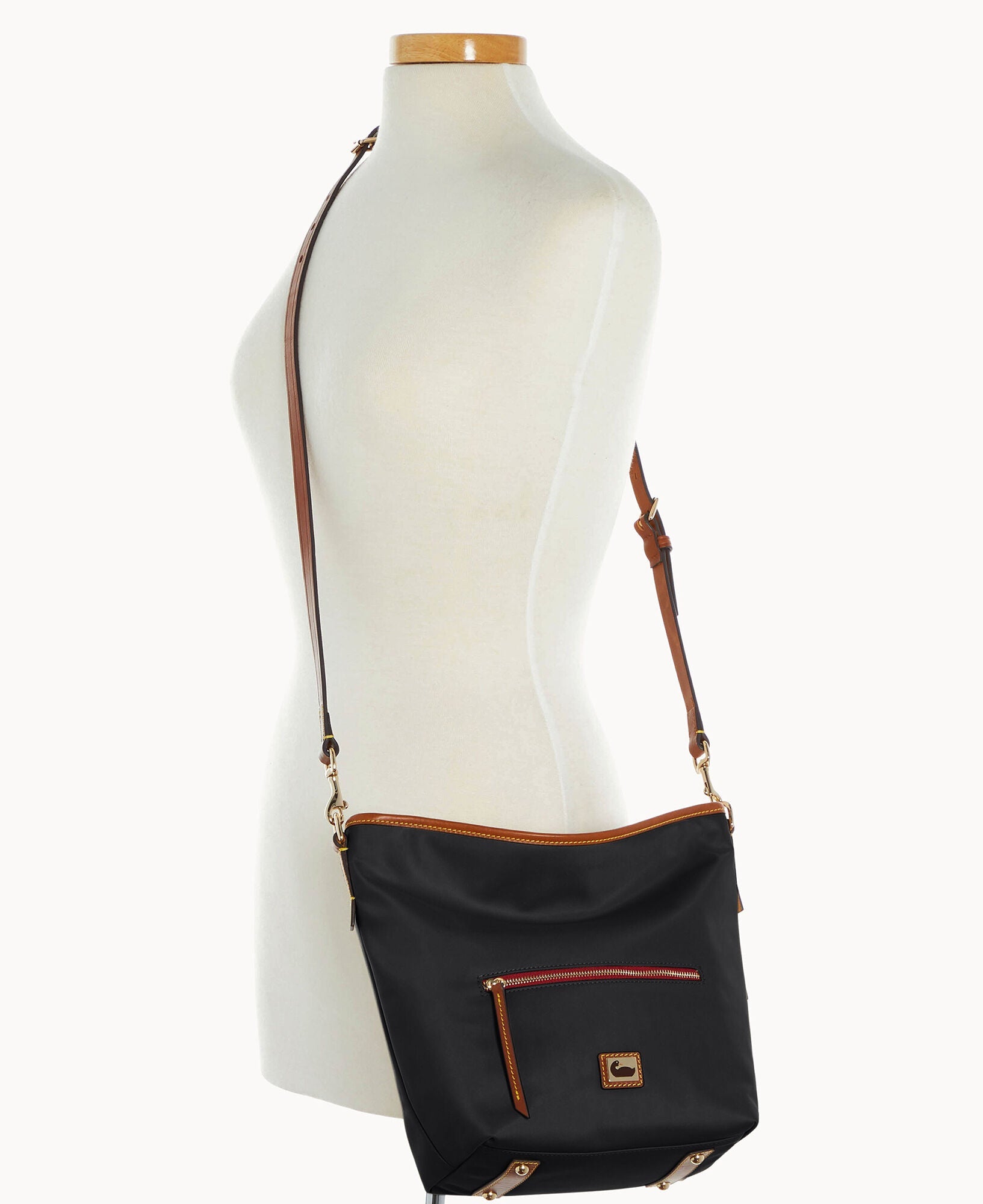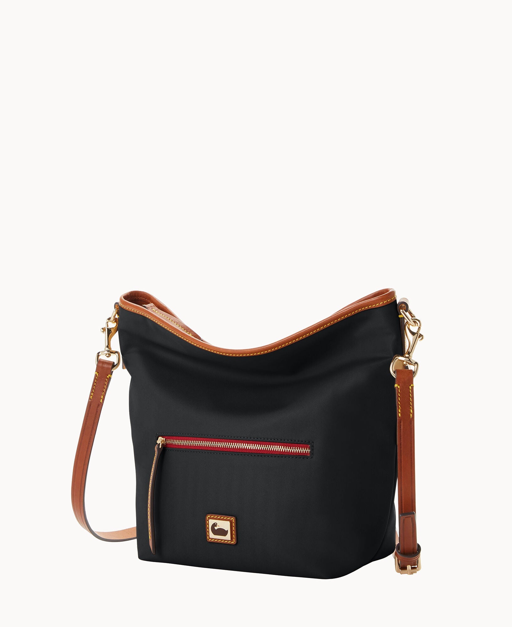 One outside zip pocket. One inside zip pocket. Two inside pockets. Cell phone pocket. Inside key hook. Adjustable, detachable shoulder strap. Feet. Zipper closure.
