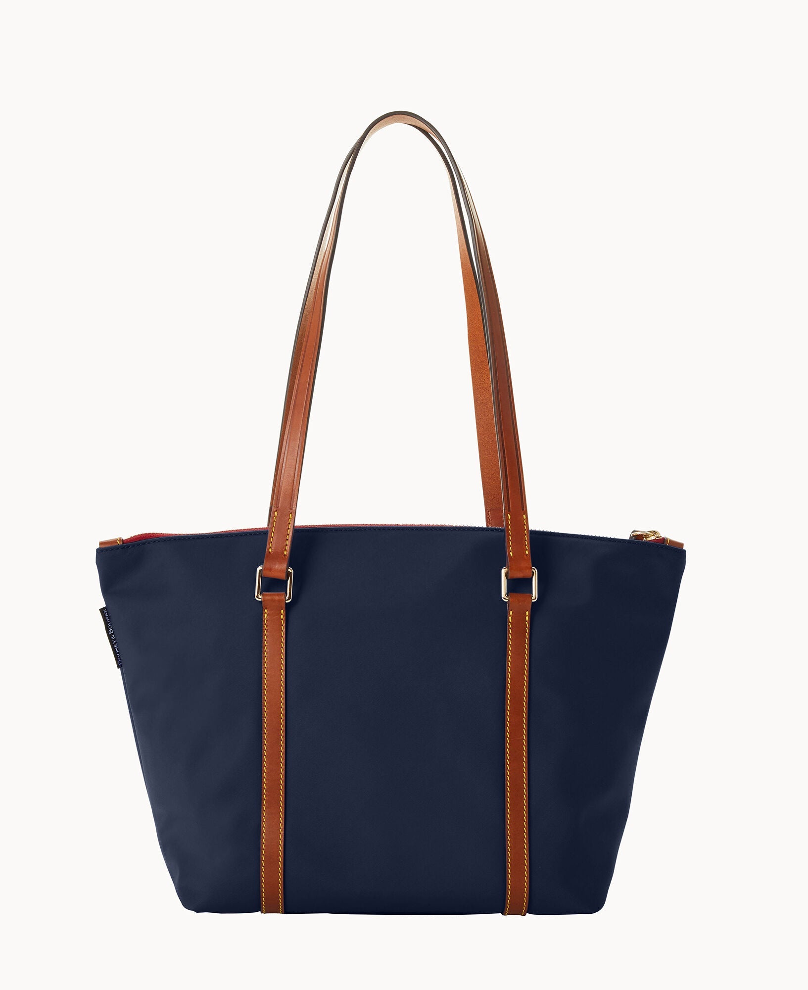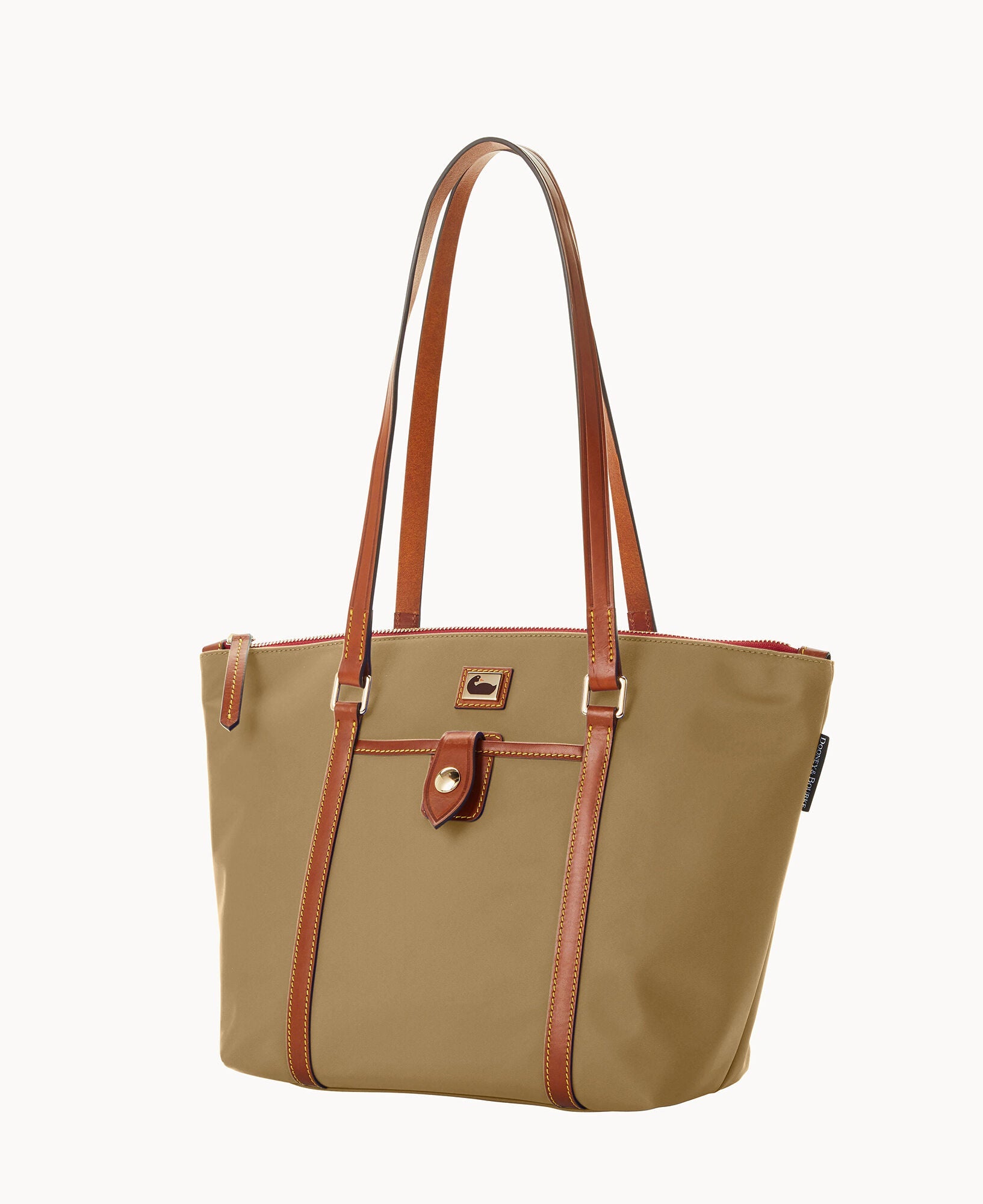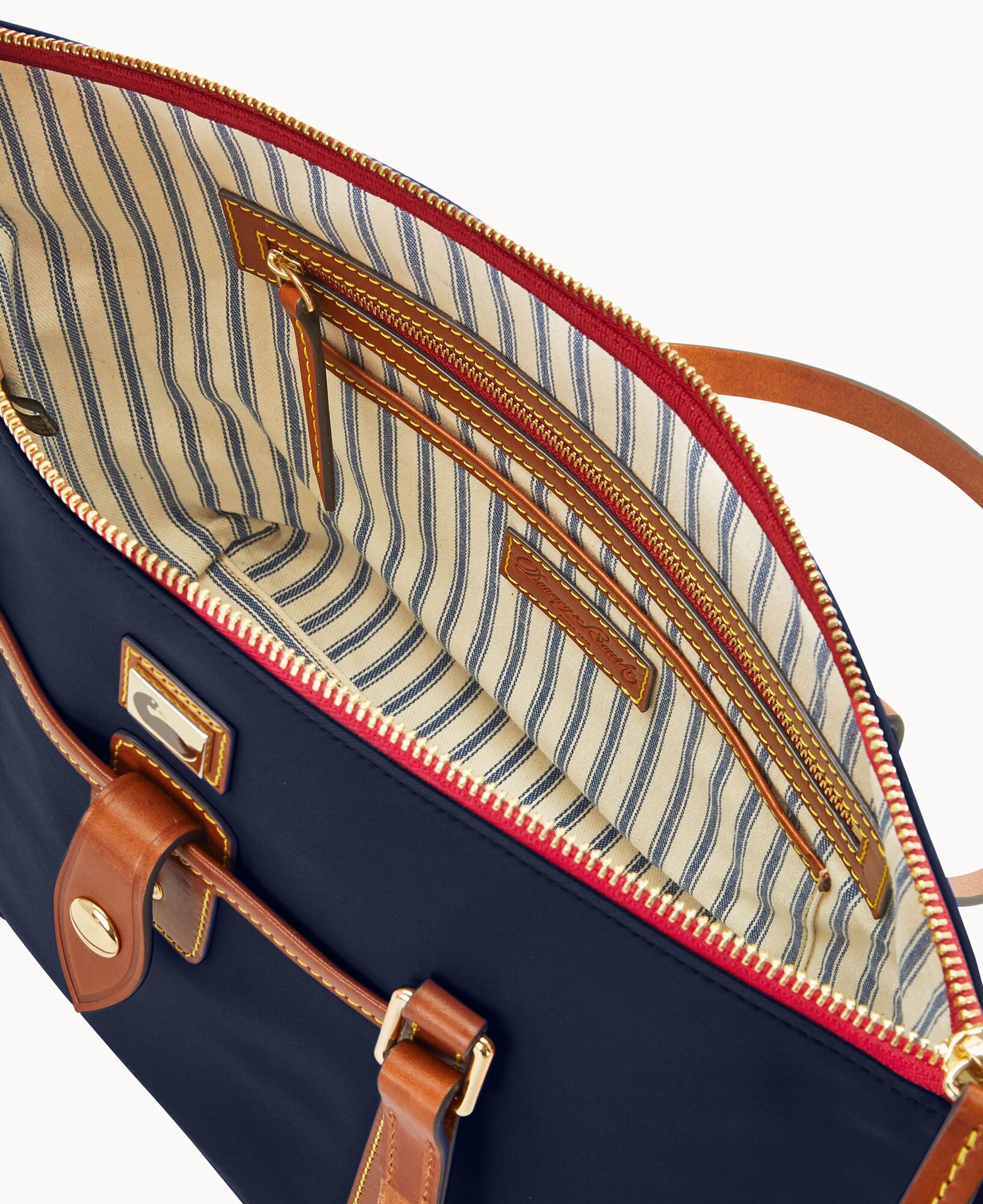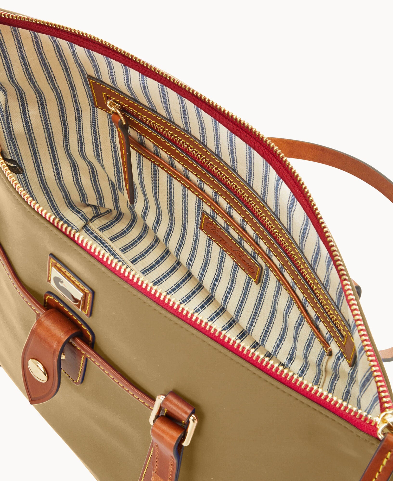 One outside pocket. One inside zip pocket. Three inside pockets. Inside key hook. Feet. Zipper closure.