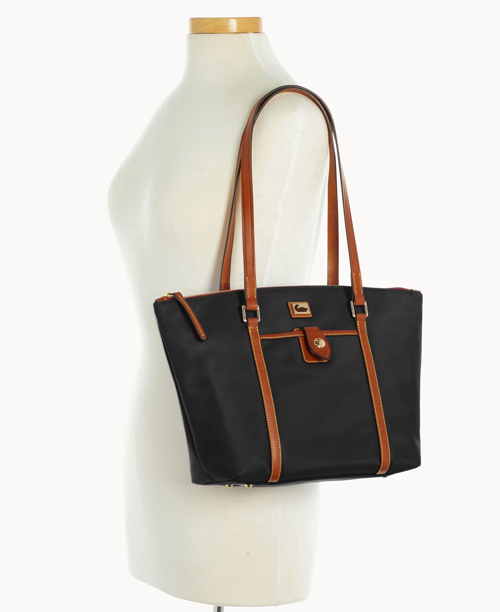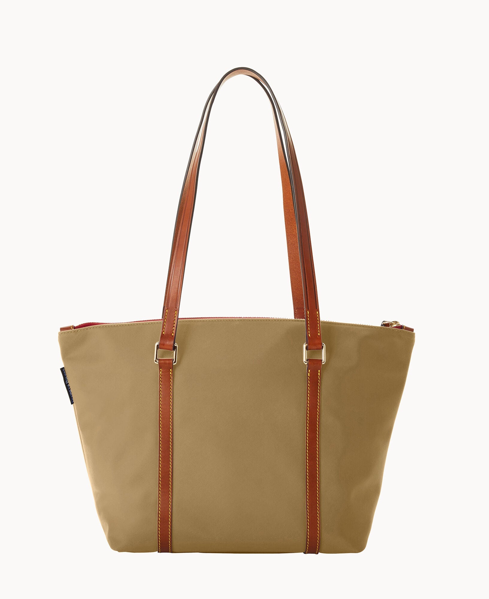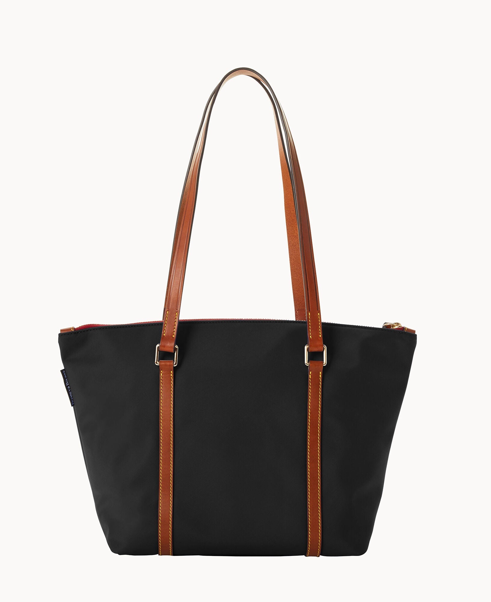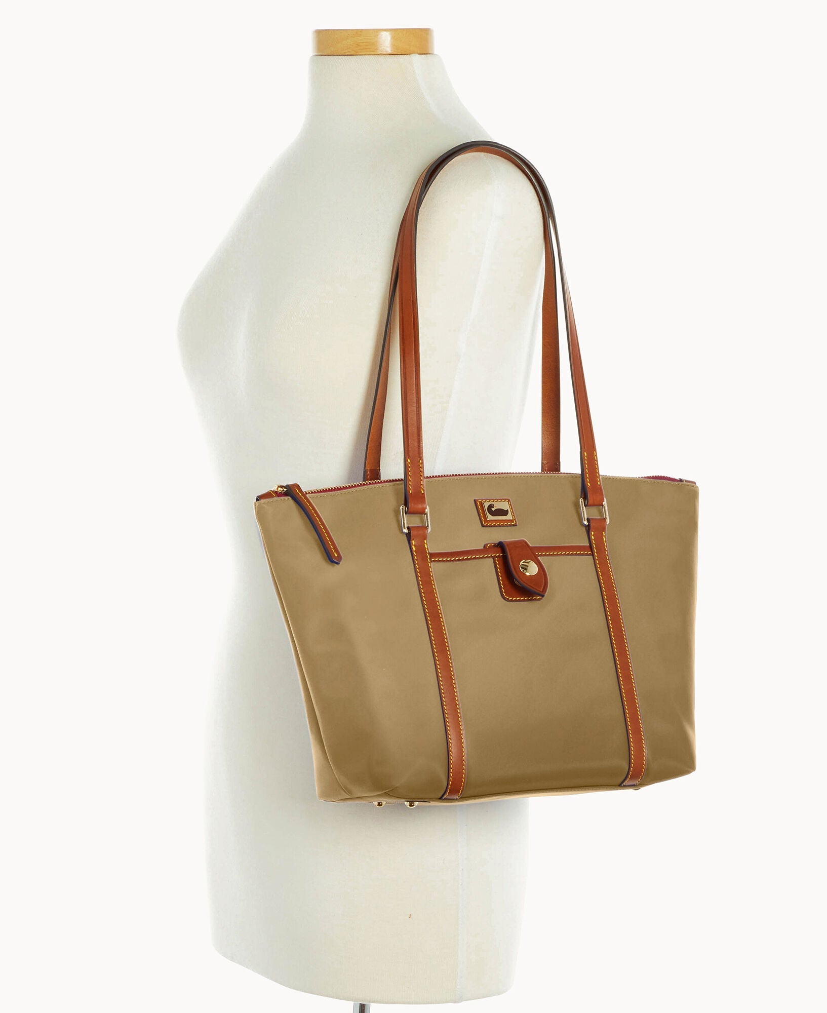 One outside pocket. One inside zip pocket. Three inside pockets. Inside key hook. Feet. Zipper closure.